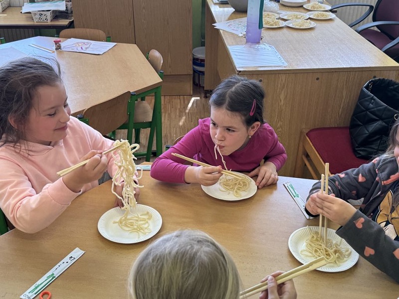 V rámci Číny se děti s velkým nadšením pokoušely jíst nudle čínskými hůlkami – tato aktivita byla jednoznačně nejoblíbenější! Za snahu si všechny děti mohly hůlky odnést domů, přičemž některé z nich doma poctivě trénovaly dál.