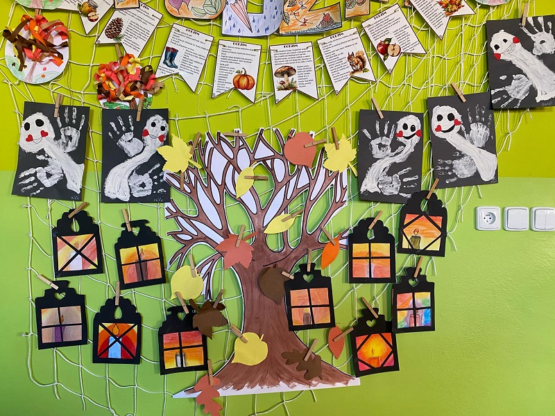 V rámci Dýňových slavností jsme vyráběli různé dýně a v rámci Dušiček jsme vyráběli lucerničky nebo vykreslovali omalovánky. Taky jsme si užili na školní zahradě Dušičkovou pátračku.