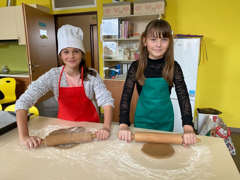 Nasadily jsme kuchařské čepice, oblékly zástěry a vrhly jsme se na pečení perníčků, které si pak mohli děti nazdobit na vánočním kumštování.