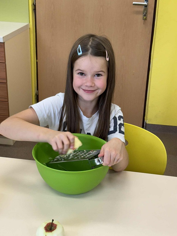 Děti si samy v družině připravily dva jablečné štrúdly – strouhaly jablka, sypaly skořici,balily těsto a na závěr potíraly štrúdle vajíčkem. Všichni si pak na upečeném štrúdlu s chutí pochutnali.