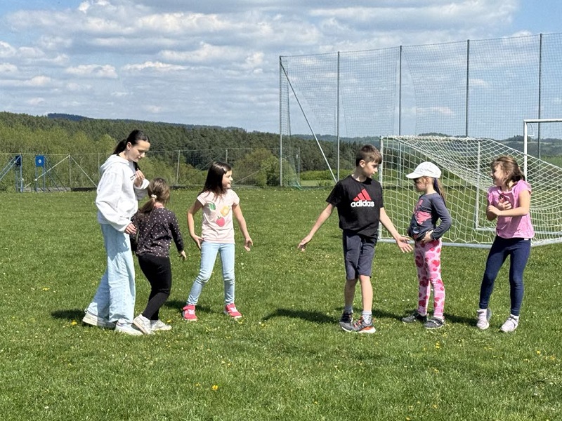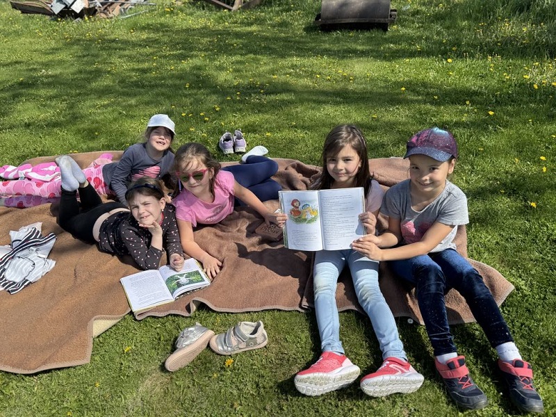 K pobytu venku jsme využili místní fotbalové hřiště, na kterém si děti zahrály fotbal a jiné míčové hry. Kdo se nechtěl zapojit do sportování, tak si alespoň zlepšoval své čtecí dovednosti.