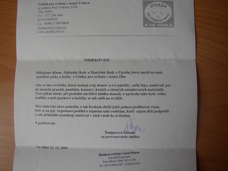 Pomoc našich dětí, kteří přispěli různými pamlsky zvířátkům ve zlínském útulku, byla mile přijata a bylo poděkováno naší škole.