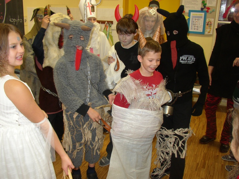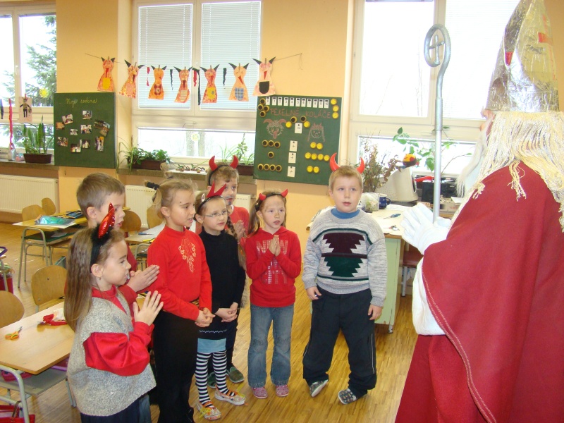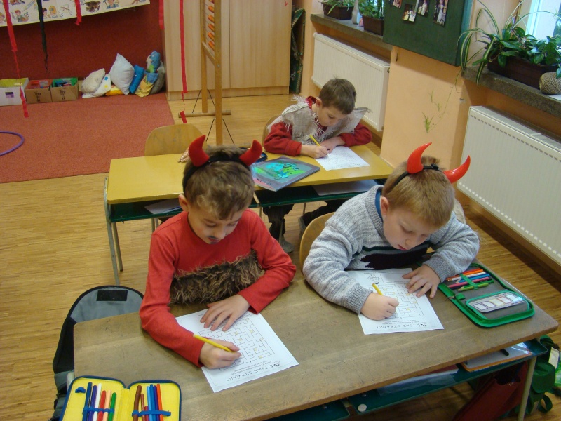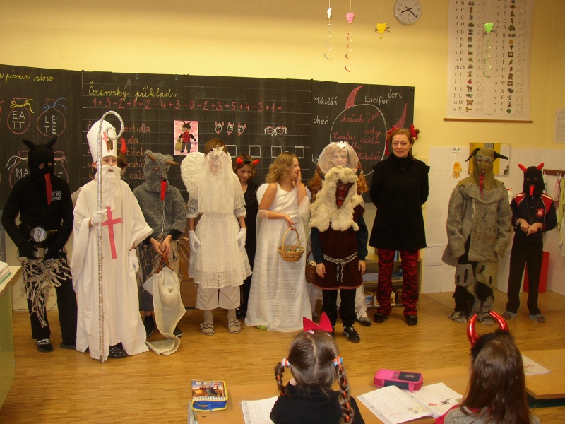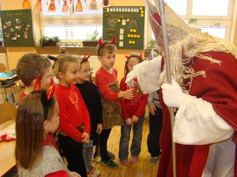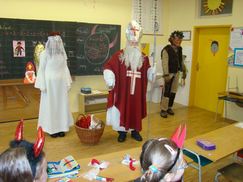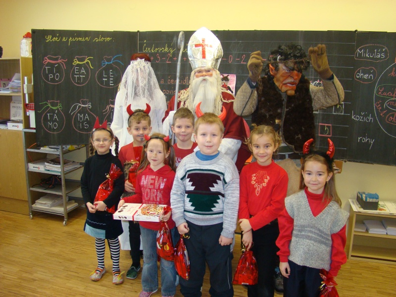 Stihli jsme si vystříhnout a nazdobit Mikuláše, čerta i anděla, ale to už vstoupil do třídy ten pravý svatý Mikuláš, který se spouští na zem po zlatém provazu právě za újezdským kostelem. Přivedl si s sebou nejen anděla s čertem, ale přinesl i veliký koš plný balíčků. Zadarmo to nebylo, ale když jsme mu zarecitovali, zazpívali a někteří se pomodlili, poslal čerta pryč a nechal nám ve třídě úplně všechny dárky. Na konci vyučování jsme si ještě vyrobili čertovské pexeso a radovali se z toho, že čert neodnesl žádného z našich kamarádů.