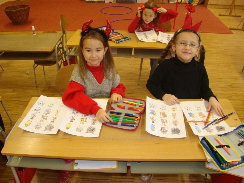 Nejdříve jsme se naučili čertovskou písničku. V matematice nás čekaly čertovské koláče, pekelné příklady a začarované kruhy. V bludišti jsme pomáhali čertíkovi najít a spočítat zlaťáky a taky jsme mu spočítali příklady v pytli. A místo jedničky s hvězdičkou, které dává naše paní učitelka, jsme od čertice dostali jedničku s čertem. Ve čtení jsme louskali a spojovali pěkně těžká Luciferova slova na tabuli. Ten dareba nám tam totiž nastrčil i písmenka, která jsme se ještě neučili. Taky nás přišli trošku postrašit namaskovaní páťáci, dokonce si přinesli pytel na neposluchy.