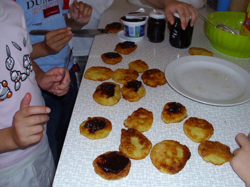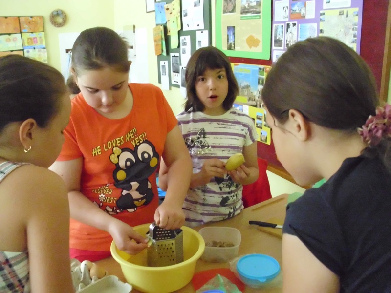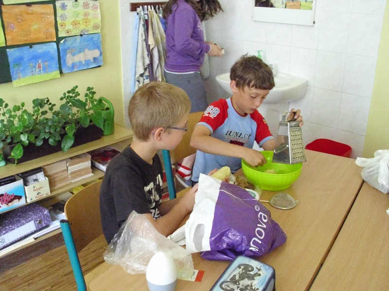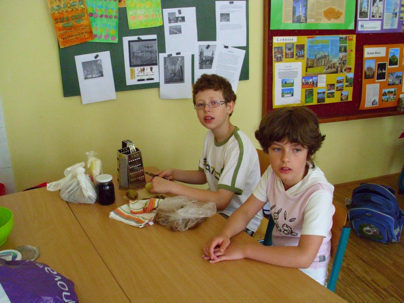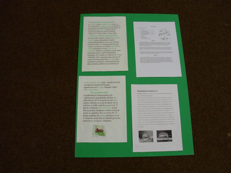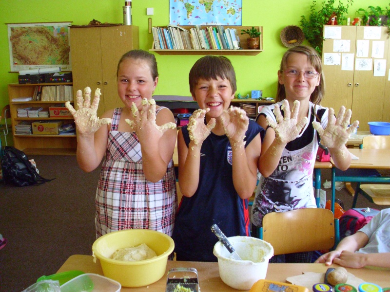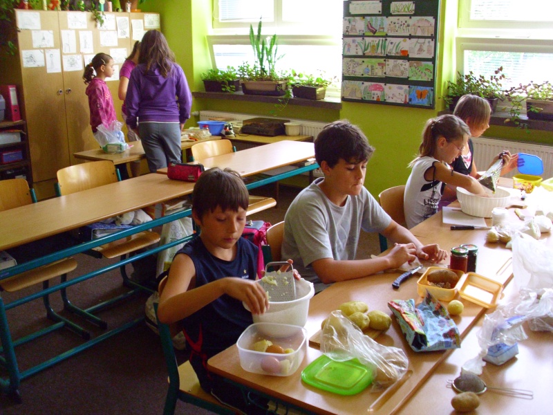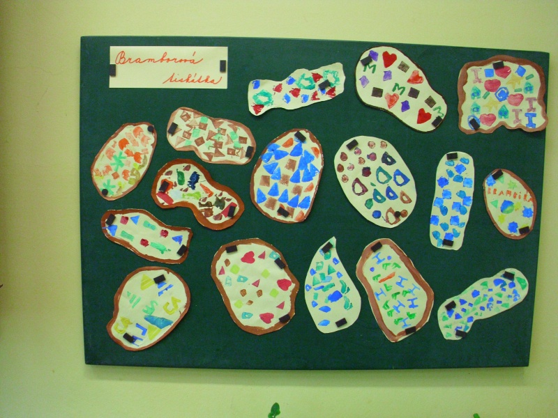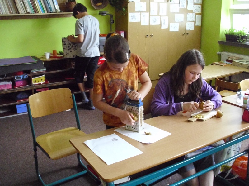 V přírodovědě jsme se učili o zemědělských plodinách. Staří Valaši pěstovali především brambory. Tak jsme hledali, co všechno se v našem kraji v minulosti z brambor vařilo. Valašská kyselice je známá, ale skoro nikdo neví, co to byly osúchy. Není to nic jiného než obyčejné bramborové placky ze zbylých vařených brambor. Moc jsme se pobavili při jejich přípravě. Potom jsme tvořili bramborová tiskátka, vyráběli škrob a nakonec přišlo i na písničky, říkadla, pohádky i rčení o bramborách. I s živou mandelinkou bramborovou jsme se osobně seznámili.Ze získaných vědomostí jsme také vytvořili projektovou tabuli, která nám bude připomínat tento den. A ještě něco. Příšerně jsme se přejedli.