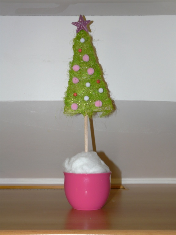 Stromeček z kokosového vlákna (barvené kokosové vlákno, tenký stříbrný drátek – včelařský nebo barvený pro výtvarníky, větší barevné korálky, přírodniny vhodné k ozdobě stromečku, květináč o průměru 10 cm vyplněný aranžovací hmotou, větší ozdobná hvězda, 2 špejle a vata)