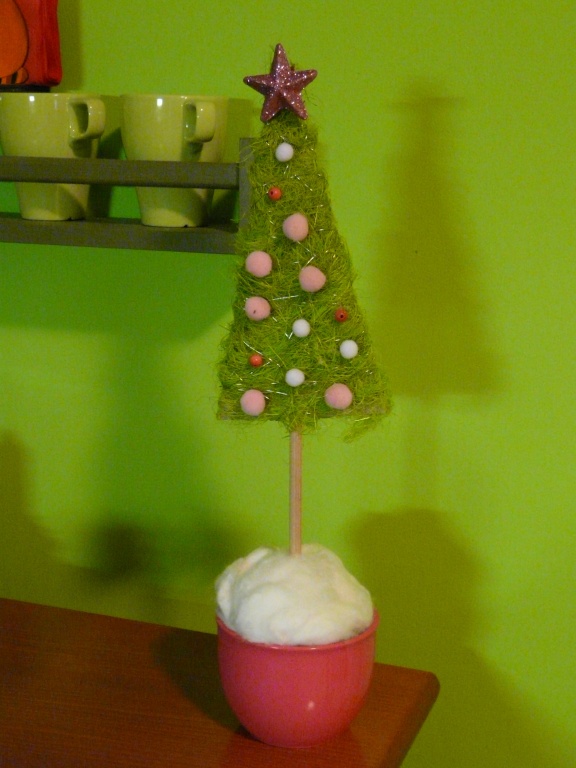 Stromeček z kokosového vlákna (barvené kokosové vlákno, tenký stříbrný drátek – včelařský nebo barvený pro výtvarníky, větší barevné korálky, přírodniny vhodné k ozdobě stromečku, květináč o průměru 10 cm vyplněný aranžovací hmotou, větší ozdobná hvězda, 2 špejle a vata)