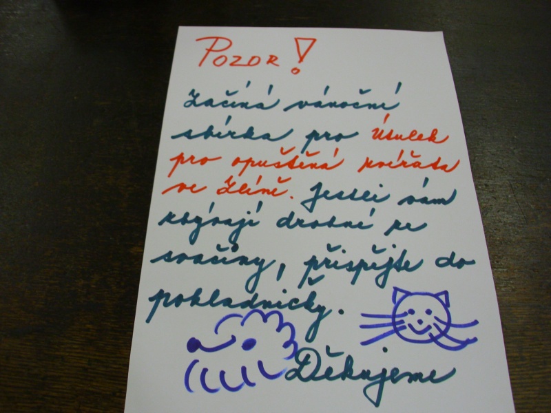 Rok se s rokem sešel a my bilancujeme, co jsme pro koho udělali, neudělali, mohli udělat, mohli udělat více... Pomohli jsme dětem z dětských domovů i zdravotně postiženým dětem, které potřebují ke své rehabilitaci koně. Ale co zvířata v nouzi? Pořád v televizi vidíme opuštěné, ba i týrané psy a kočky i jiná zvířata.Naše škola ale spolupracuje se zlínským útulkem Zvířata v nouzi. Dvakrát ročně, před Vánocemi a před letními prázdninami děláme sbírku pro pejsky a kočičky. Letos se zapojily všechny třídy naší školy, ale úspěšná byla i naše MŠ. Velký dík patří kolegyním z MŠ a paní zástupkyni RNDr. Miladce Světlíkové, která nás před lety na útulek upozornila, a všem, kdo do této sbírky přispěli, byť by to bylo drobnými ze svačiny. Takto jsme kromě jídla a potřebných věcí vybrali ještě 400 Kč, které odešly přes účet do zlínského útulku.Jako poděkování útulku jsme dostali od vedoucí paní Šmigurové pexesa s nejkrásnějšími zvířátky zlínského útulku. Vedení útulku i všem pejskům a kočičkám přeji hezké Vánoce .