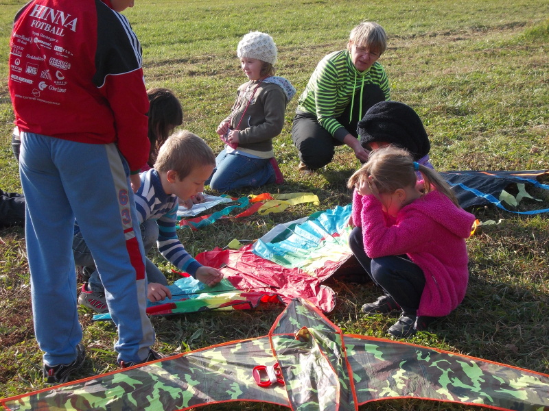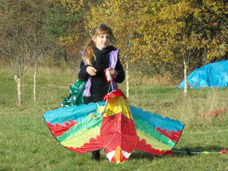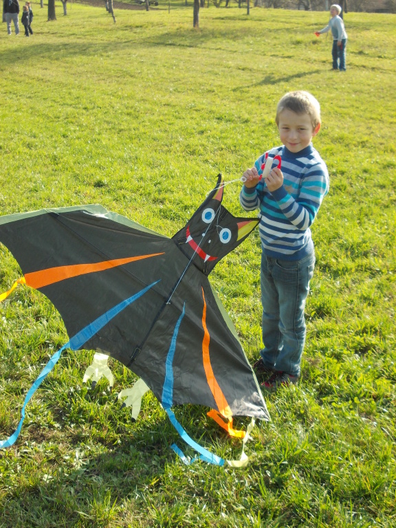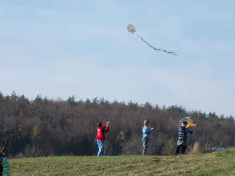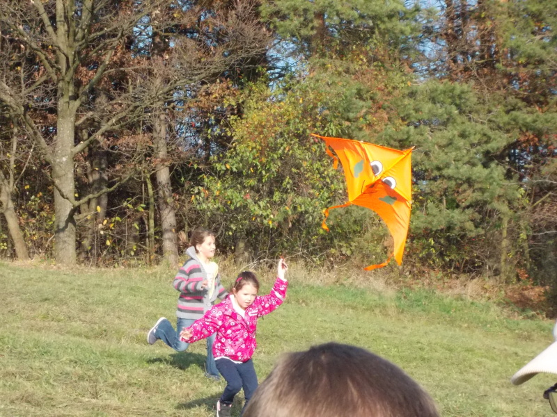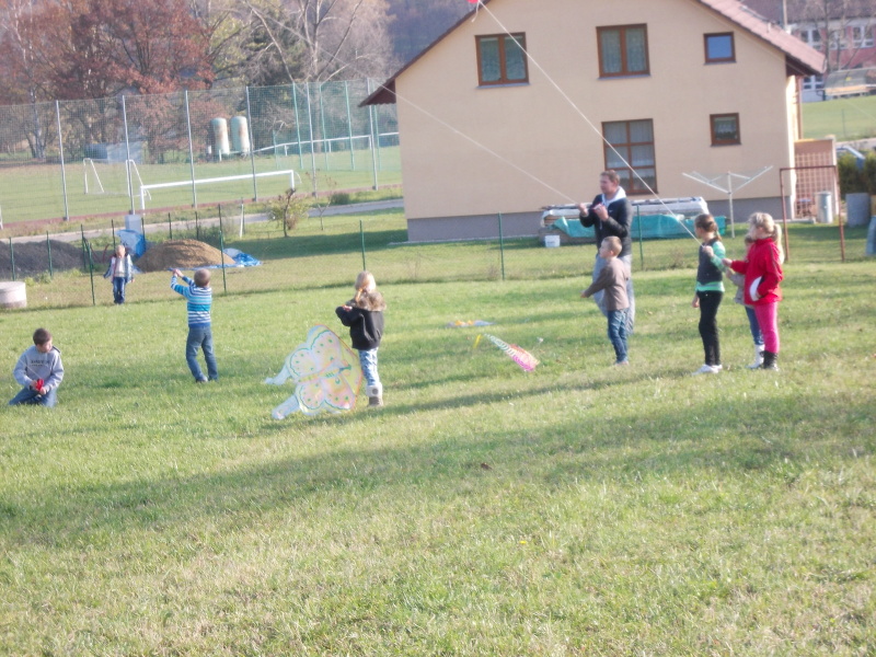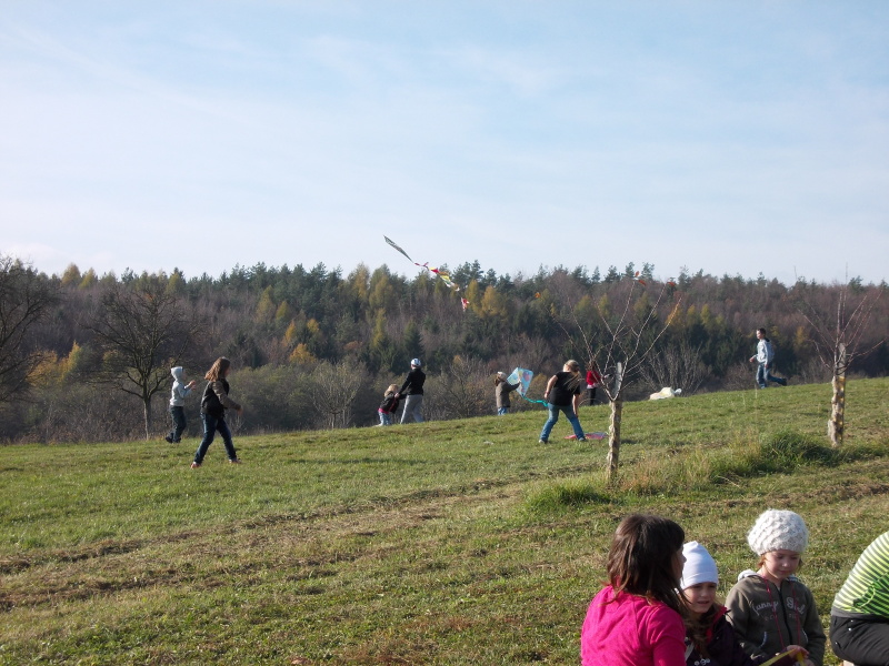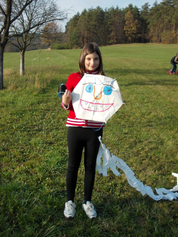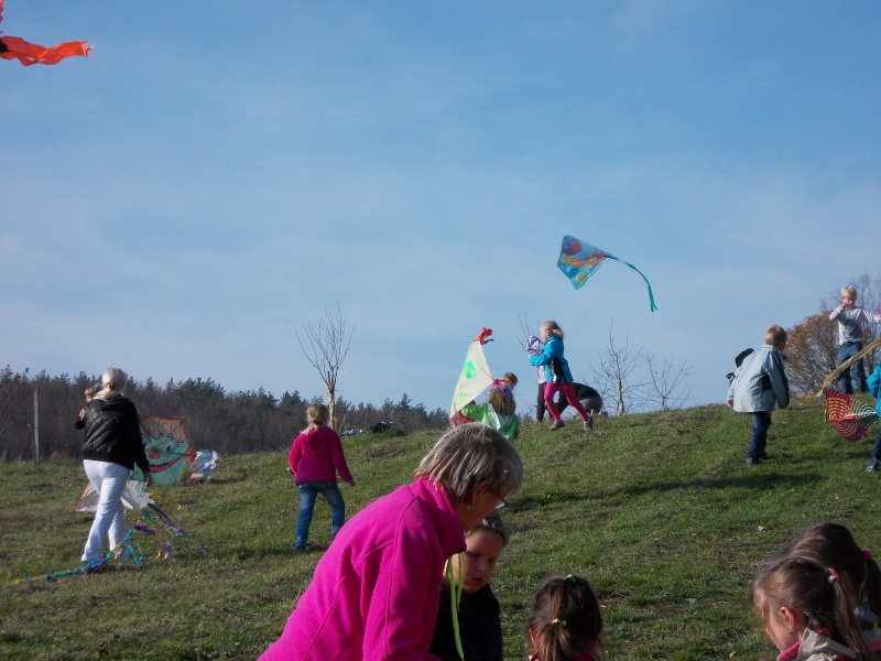 Od rána jsme s napětím sledovali počasí, které nás nakonec nezklamalo a přálo nám. Po obědě jsme se vydali na kopec k blízkému lesu, kde děti začaly pouštět své draky. Děti byly moc šikovné. V hojném počtu si přinesly vyrobené nebo koupené dráčky, kteří se vznášeli vysoko a „krásně se na nás shora usmívali a třepotali svými ocásky.“