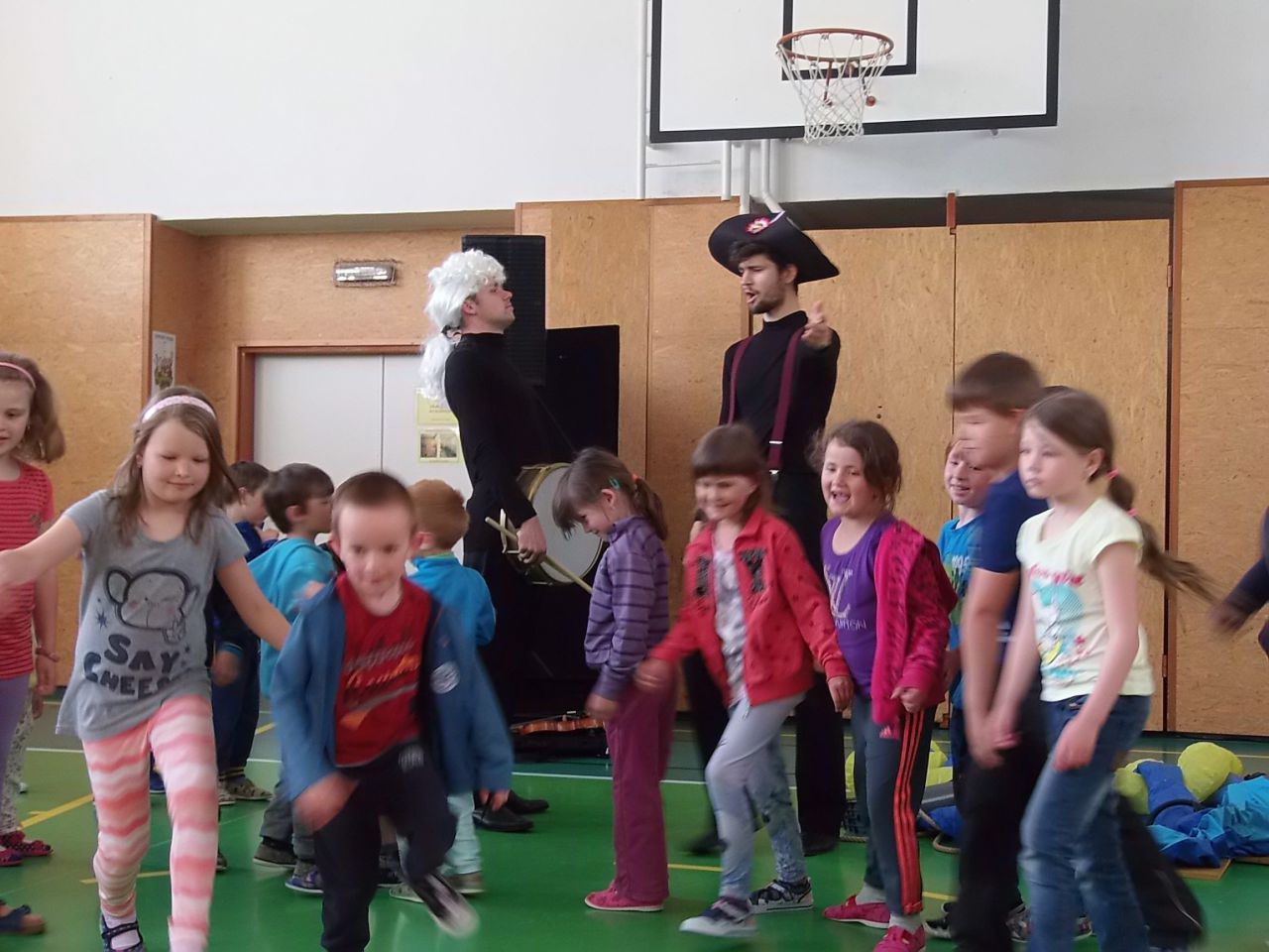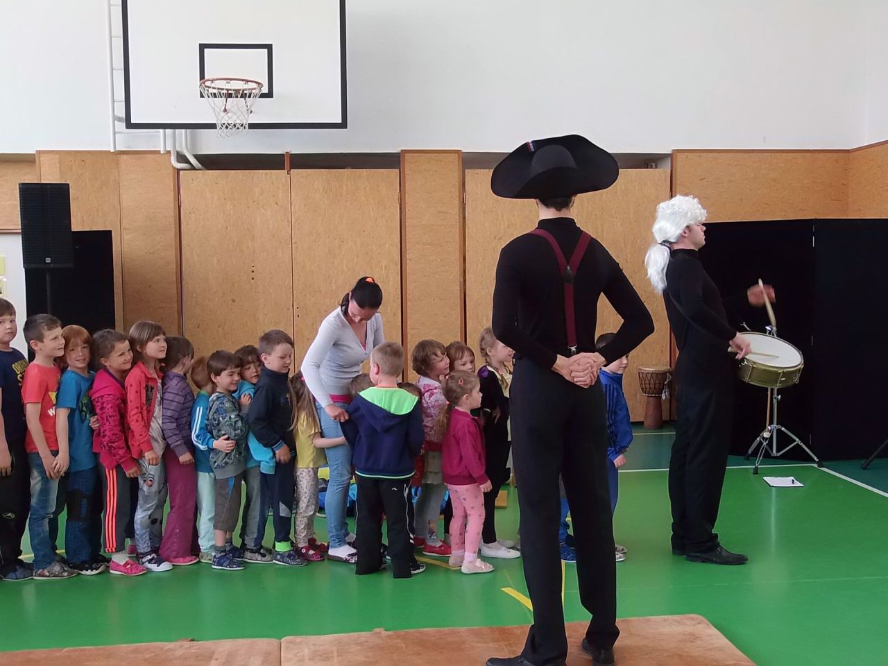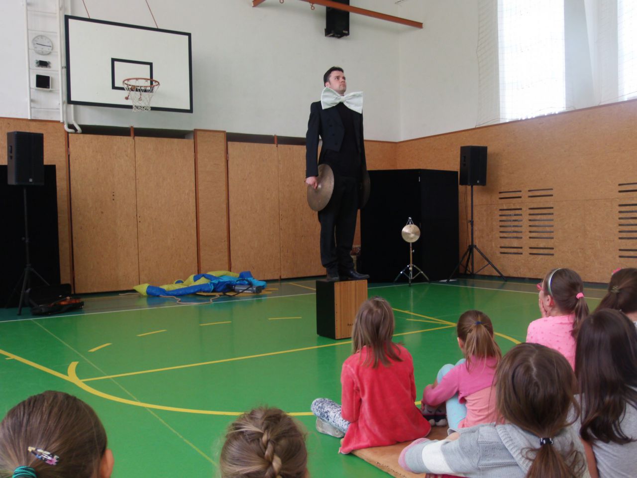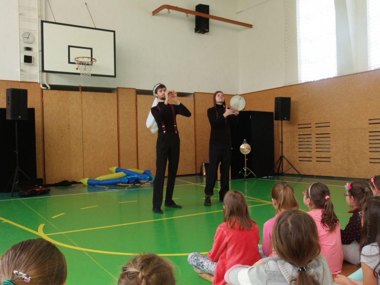 Ve čtvrtek 18.5. k nám zavítali profesionální hudebníci z Brna, aby dětem z 1. stupně a MŠ přiblížili jednotlivá hudební období - pravěk, starověk, středověk, novověk a hudbu 20. stolení. Předvedli také důležitost rytmu a hudby pro člověka v těcho historických etapách. Do děje se zapojily i děti a staly se tak součástí velmi zdařilého představení.