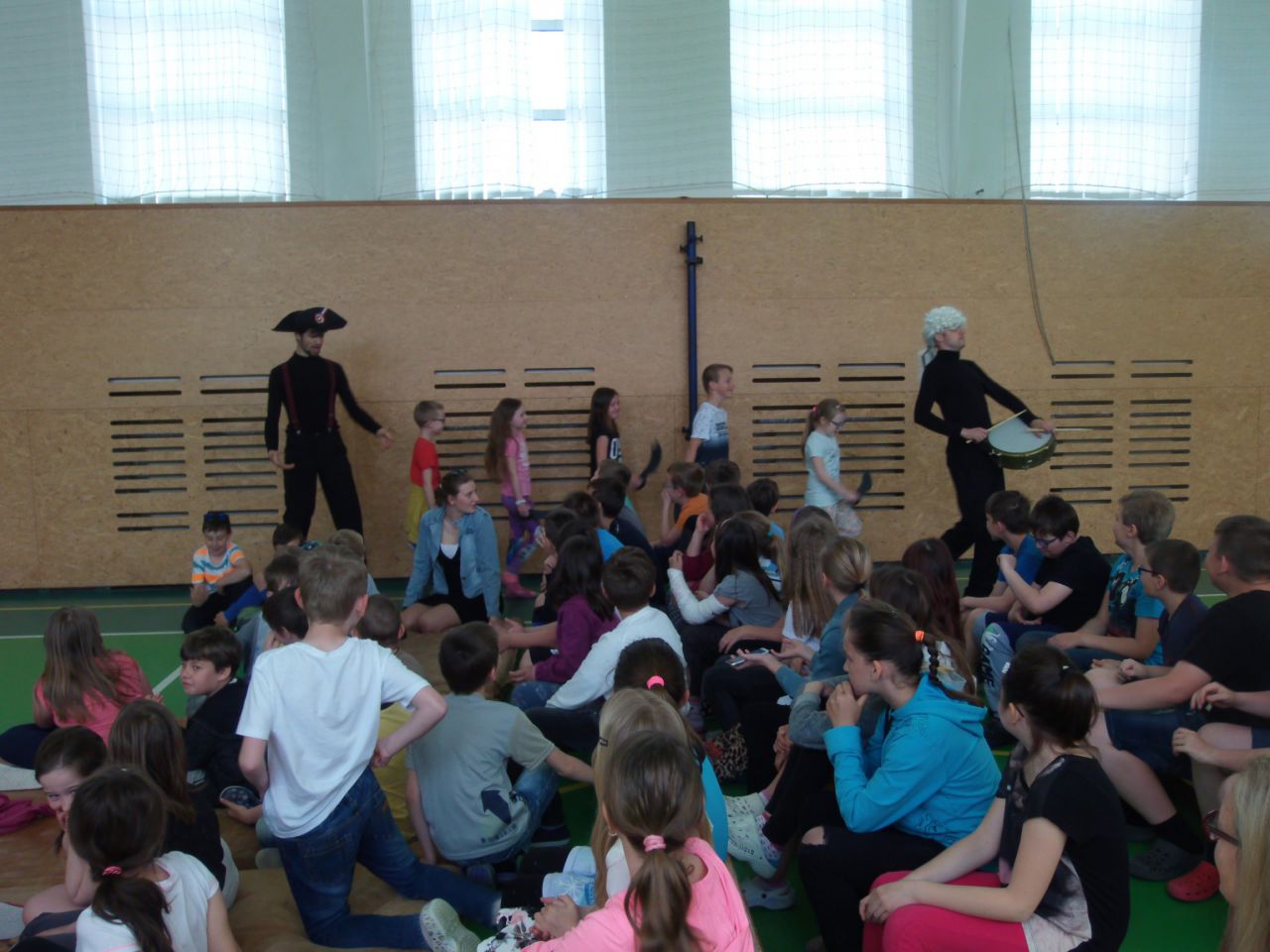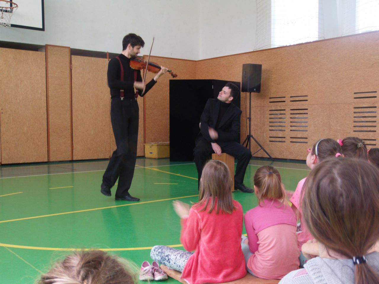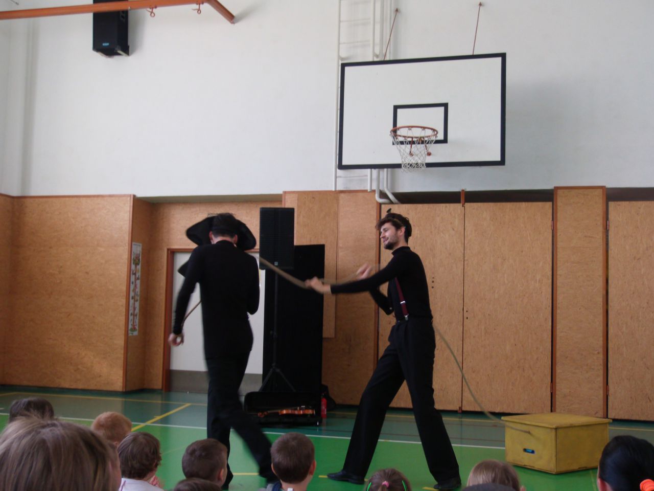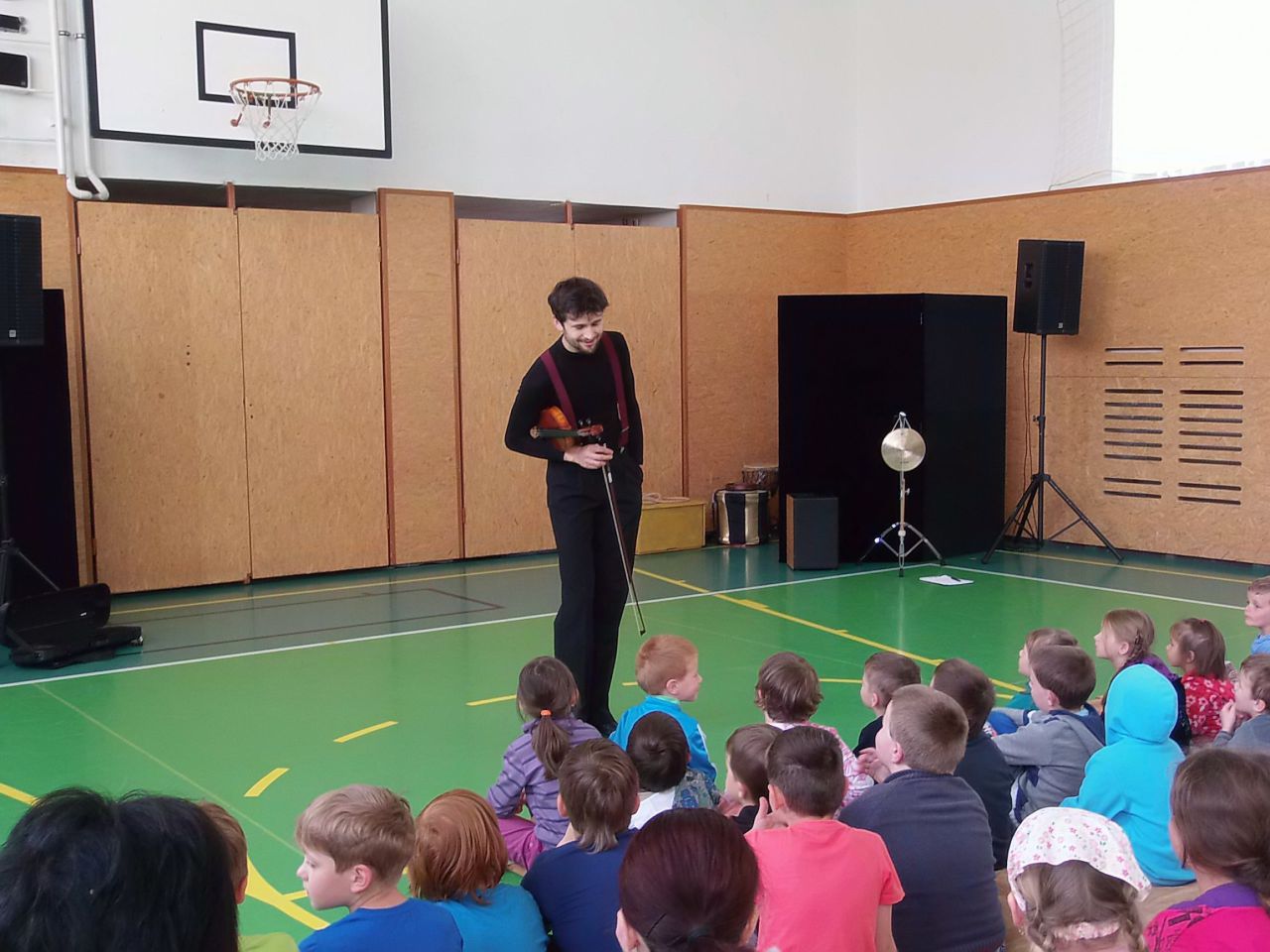 Ve čtvrtek 18.5. k nám zavítali profesionální hudebníci z Brna, aby dětem z 1. stupně a MŠ přiblížili jednotlivá hudební období - pravěk, starověk, středověk, novověk a hudbu 20. stolení. Předvedli také důležitost rytmu a hudby pro člověka v těcho historických etapách. Do děje se zapojily i děti a staly se tak součástí velmi zdařilého představení.