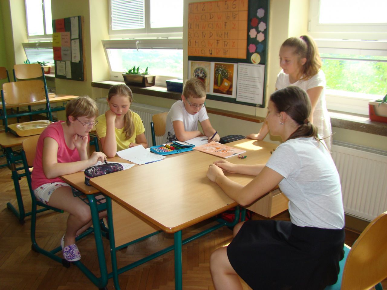 V pátek 15.6. si děti z kroužku němčiny zahrály soutěž „O poklad“. Děvčata z 8. ročníku připravila soutěžní otázky a kvízy na různá témata. V průběhu soutěže dívky dohlížely na plnění jednotlivých úkolů. Výsledky skupin byly natolik vyrovnané, že se o poklad podělily všechny děti.