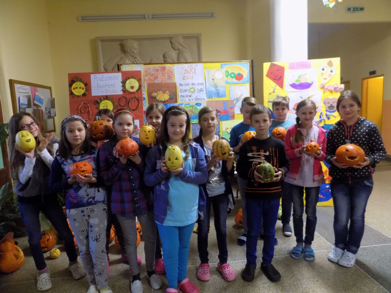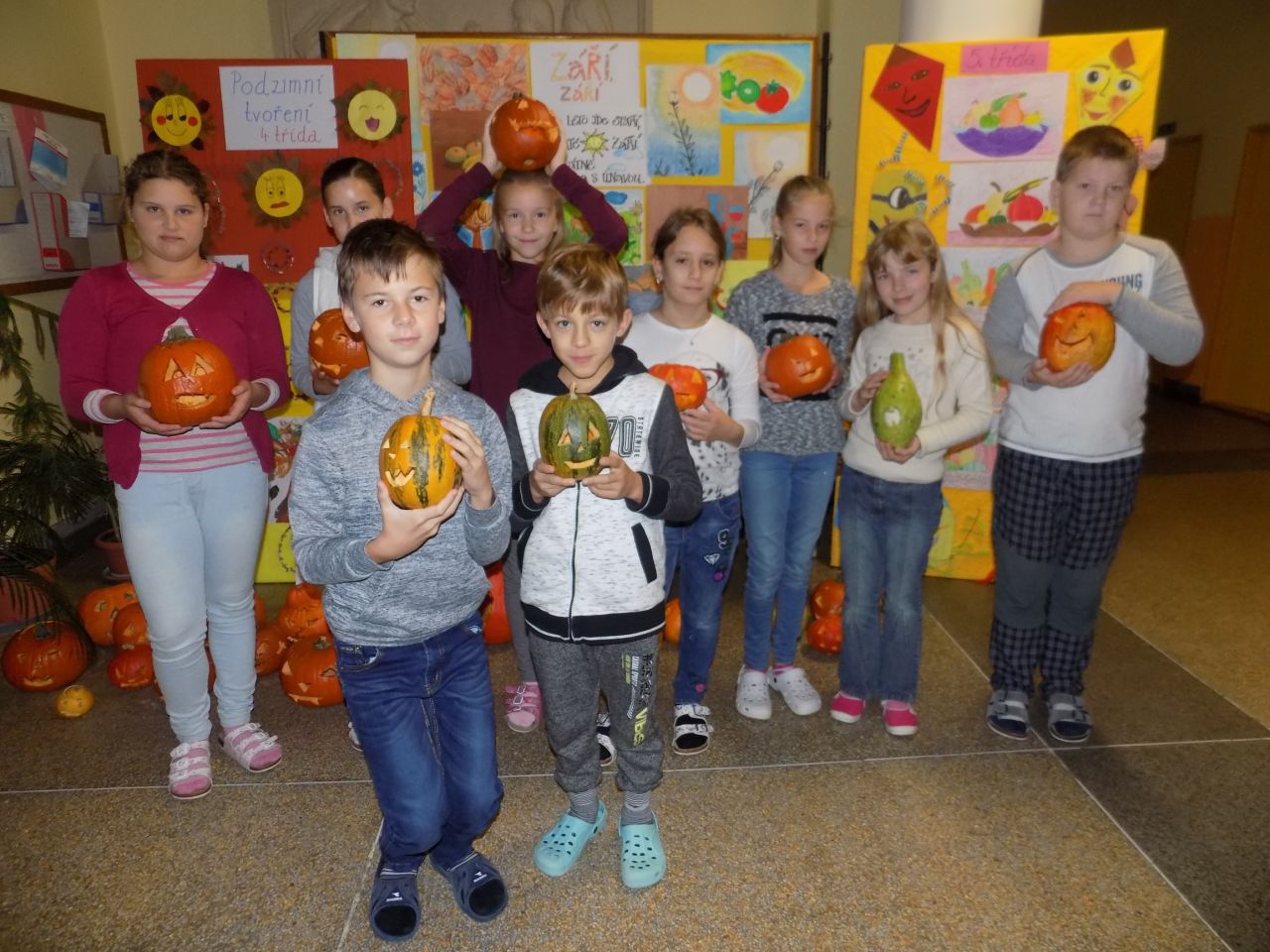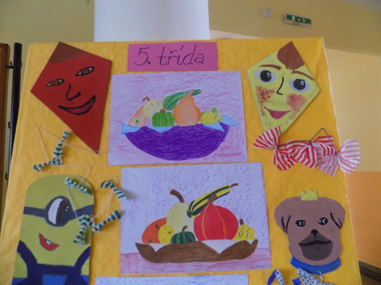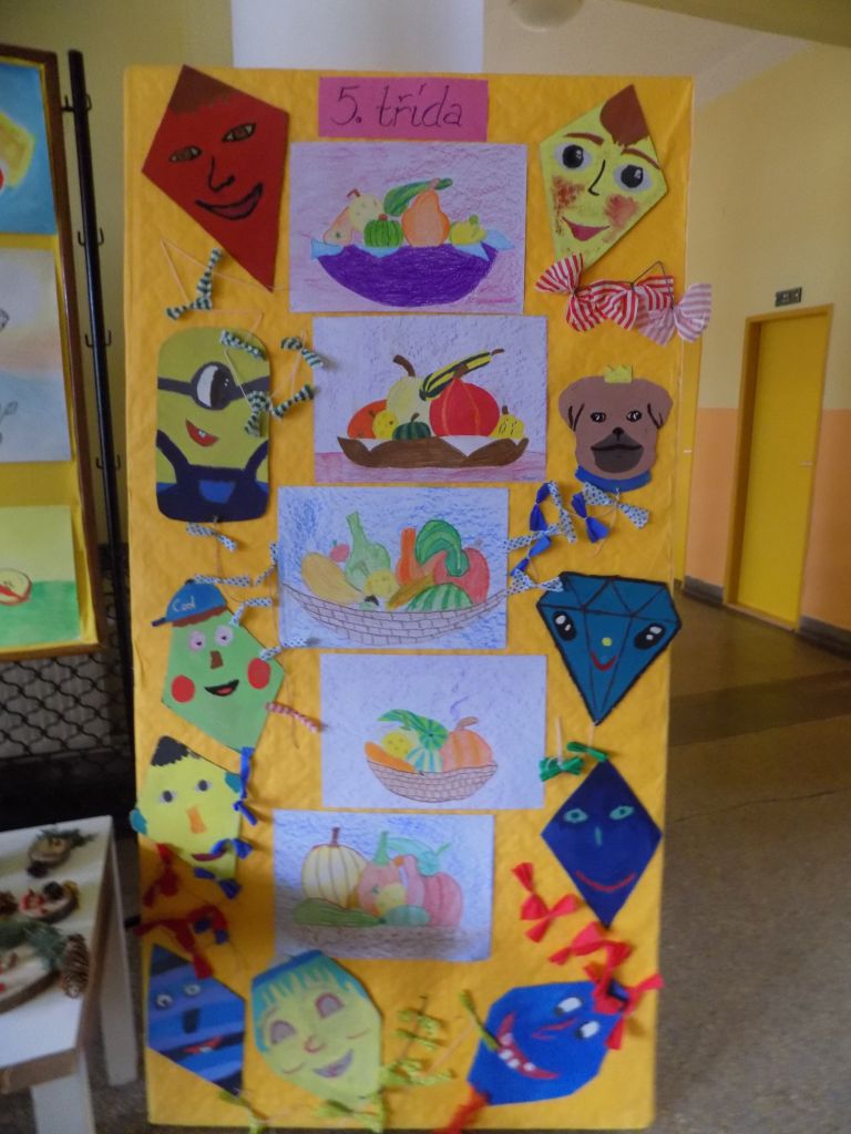 My, žáci 5. třídy, jsme v hodinách Vv a Pč ztvárnili podzim různými způsoby - zajímavými draky, podzimními stromy a listy, ovocem, kouzelnými sovičkami, podzimními skřítky a nakonec strašidelnými dýněmi, které jsou spolu s některými dalšími výtvory vystaveny ve vestibulu naší ZŚ.