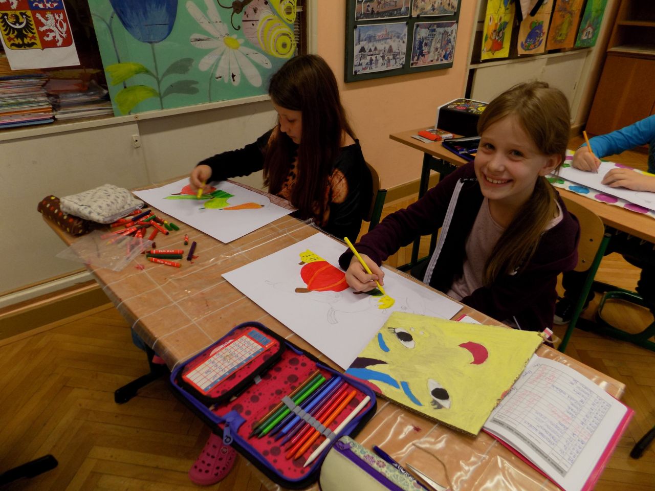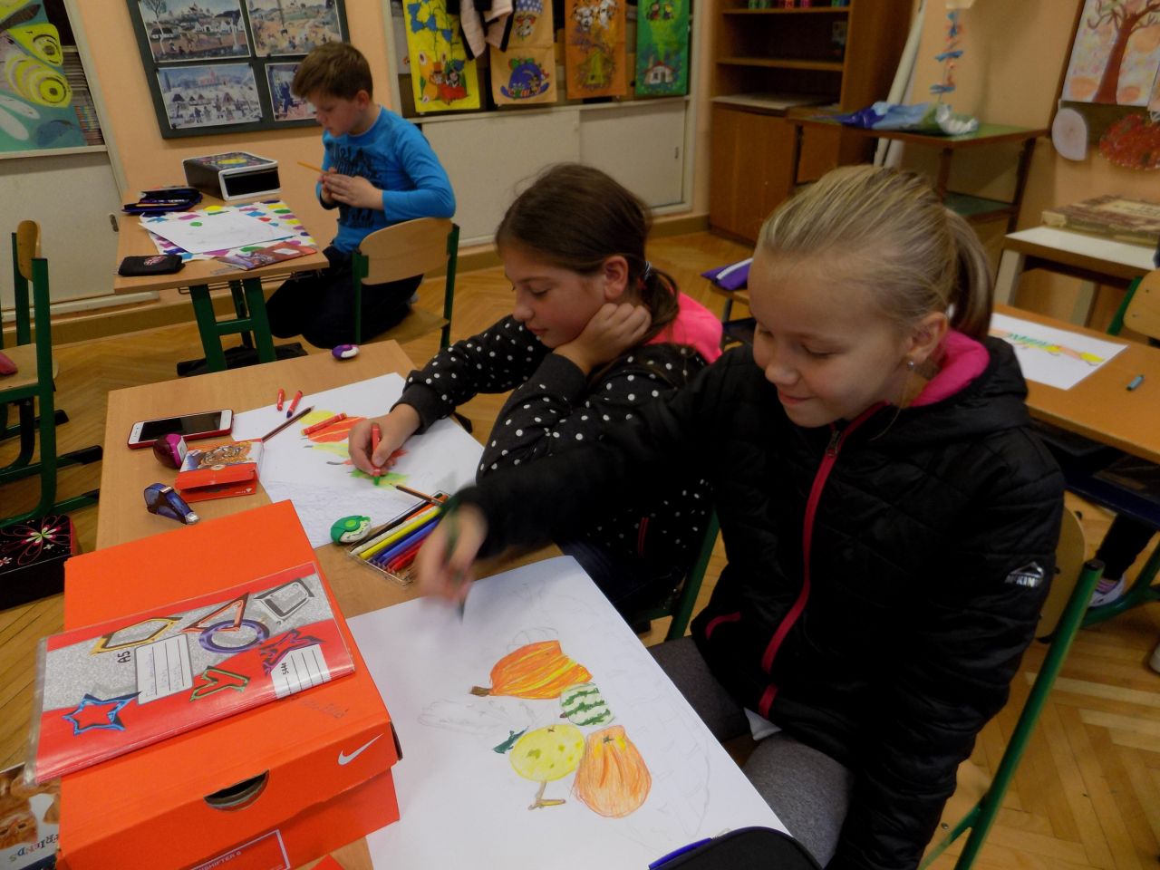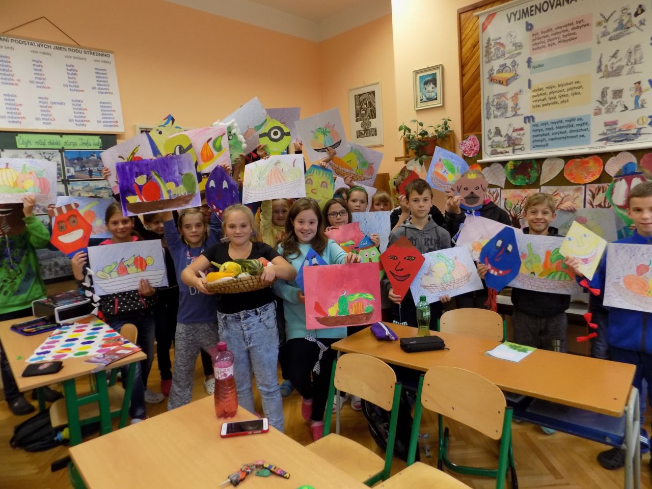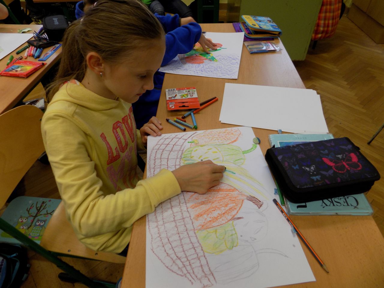 My, žáci 5. třídy, jsme v hodinách Vv a Pč ztvárnili podzim různými způsoby - zajímavými draky, podzimními stromy a listy, ovocem, kouzelnými sovičkami, podzimními skřítky a nakonec strašidelnými dýněmi, které jsou spolu s některými dalšími výtvory vystaveny ve vestibulu naší ZŚ.