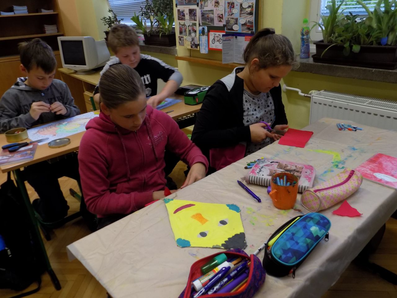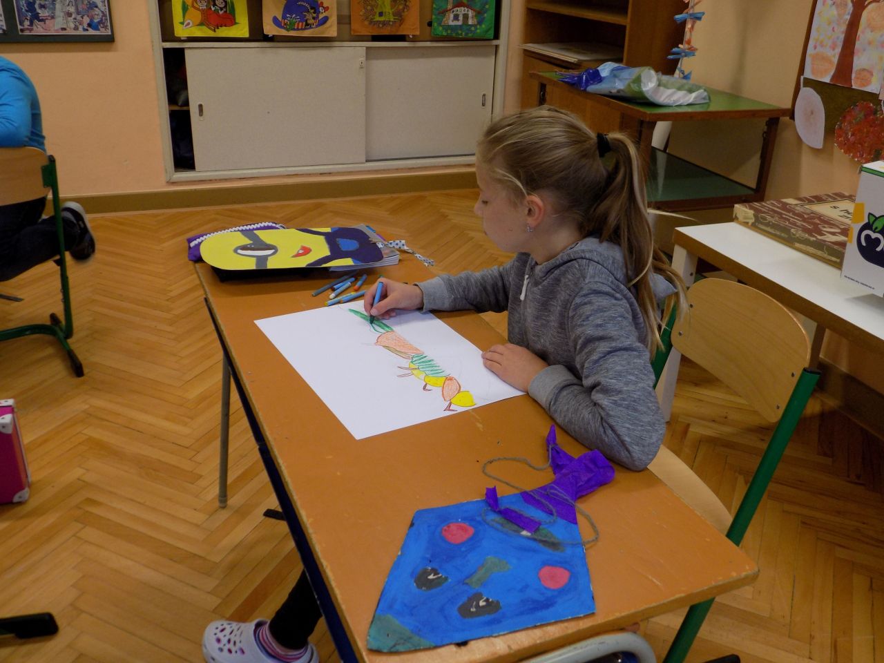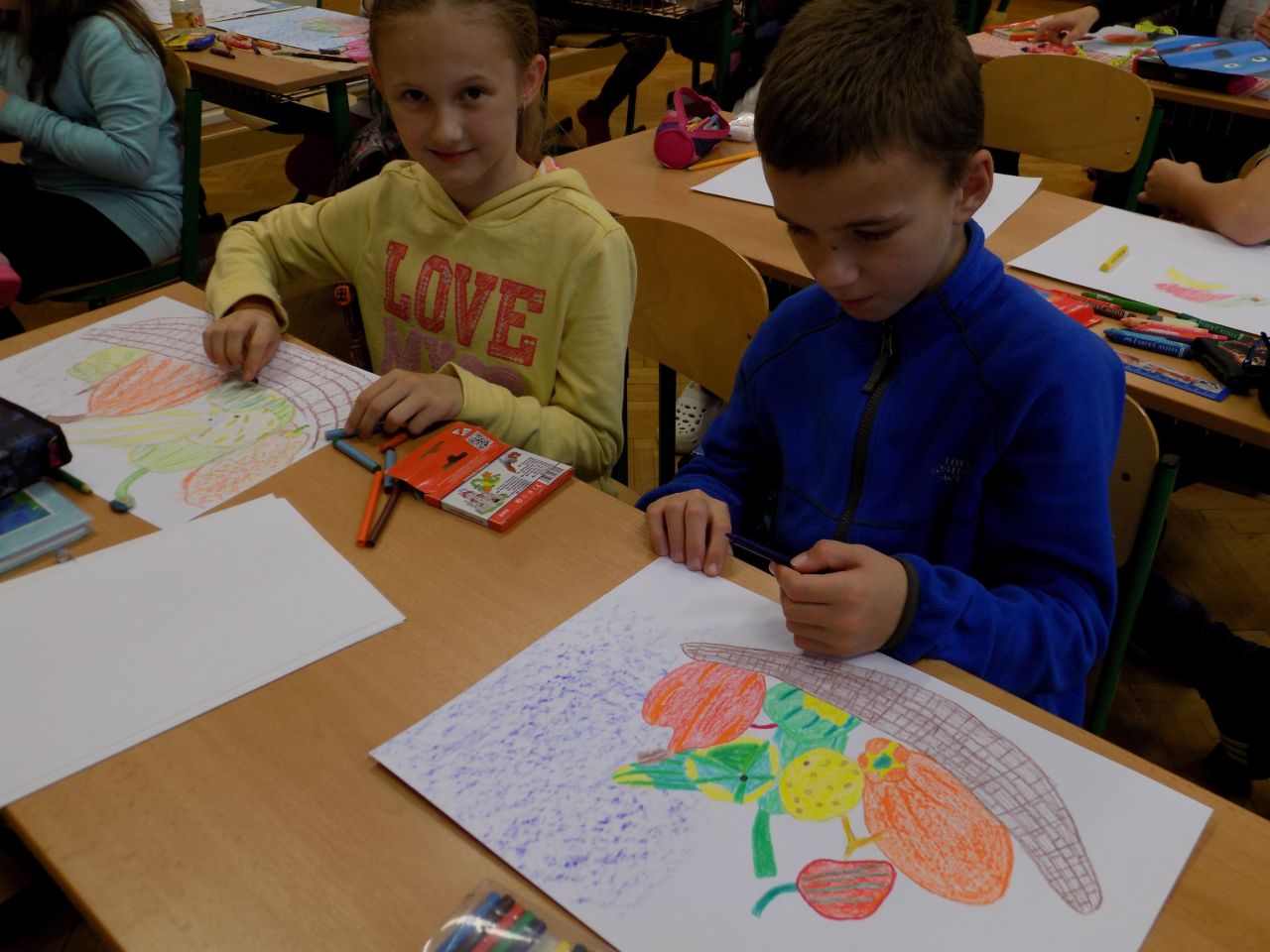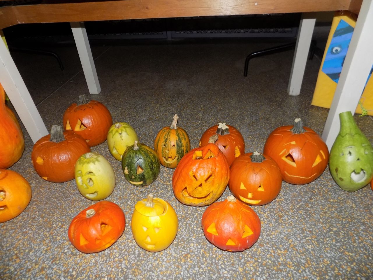 My, žáci 5. třídy, jsme v hodinách Vv a Pč ztvárnili podzim různými způsoby - zajímavými draky, podzimními stromy a listy, ovocem, kouzelnými sovičkami, podzimními skřítky a nakonec strašidelnými dýněmi, které jsou spolu s některými dalšími výtvory vystaveny ve vestibulu naší ZŚ.