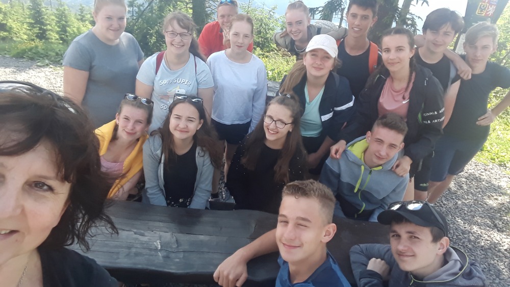 Poslední výlet 9. ročníku se uskutečnil ve dnech 24.-25.6. 2019. Tentokrát jsme se rozhodli pro zdolání nejvyššího vrcholu Beskyd, Lysé hory. Odjížděli jsme v 6 hodin ráno vlakem z Valašských Klobouk. I když jsme museli několikrát přesedat a z důvodu výluky na trati museli cestovat i autobusem, dorazili jsme do cíle včas. Po ubytování v malebném prostředí TJ Sokol Ostravice jsme vyrazili na túru. Počasí nám přálo, a tak jsme po téměř 3,5 hodinovém namáhavém výšlapu zdolali nejvyšší vrchol. Cesta zpět už byla rychlejší. Ti odvážní se osvěžili brouzdáním v řece Ostravici a načerpali tak nové síly k volejbalovému klání. Večer jsme strávili všichni společně na terase chaty. Druhý den jsme spíše relaxovali, prošli jsme se po městě, mavštívili jsme výstavu dřevěných soch, poobědvali v pěkné restauraci v areálu TJ, ještě si zahráli volejbal a odcestovali zpět do svých domovů.