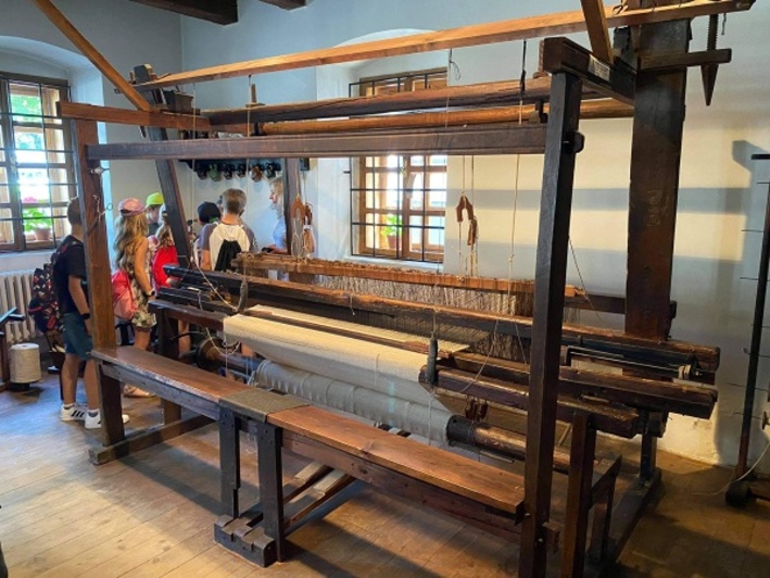 Po prohlídce muzea jsme se přemístili do Červeného domu v dolní části náměstí. Zde jsme obdivovali krásu starých předmětů, které usnadňovaly život lidí v minulém století, ale i v dobách starších. Děti se například seznámily s předchůdkyní pračky, sporáku, vysavače, některé poprvé viděly tkalcovský stav, poznaly výrobu a barvení látek – modrotisk, zajímavý pro ně byl i vystavovaný nábytek, či způsob oblékání v dávných dobách.
