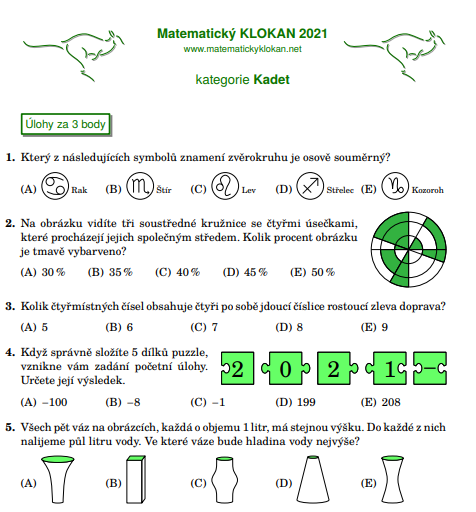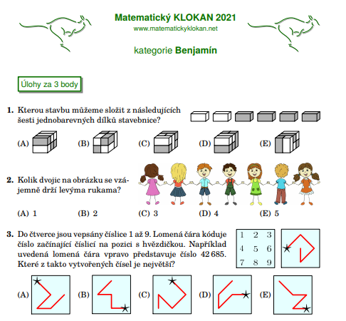 Soutěžící ZŠ jsou podle věku rozděleni do 4 kategorií: Cvrček (2. - 3. třída ZŠ), Klokánek (4. - 5. třída ZŠ), Benjamín (6. - 7. třída ZŠ), Kadet (8. - 9. třída ZŠ).