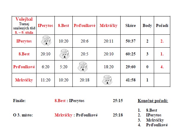Ve starší kategorii už byl vidět volejbal na velice solidní úrovni. Nakonec s přehledem zvítězilo družstvo z 8.B před svými soky z 8.A. Třetí místo vybojovalo družstvo z 9.A.