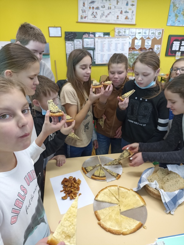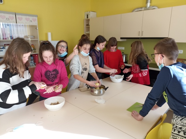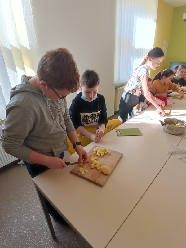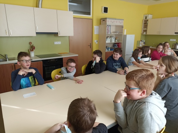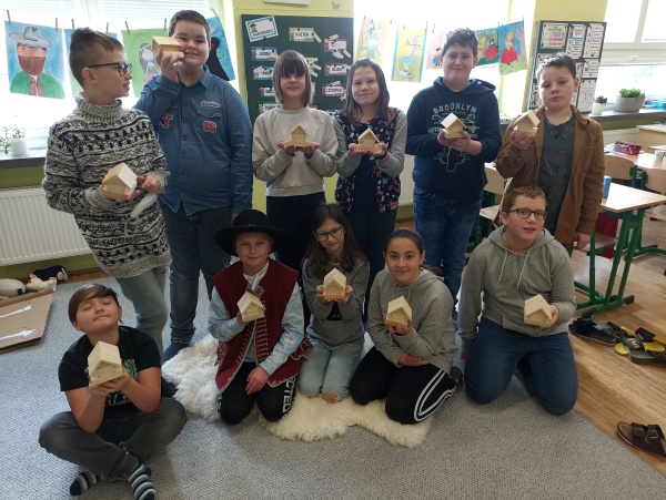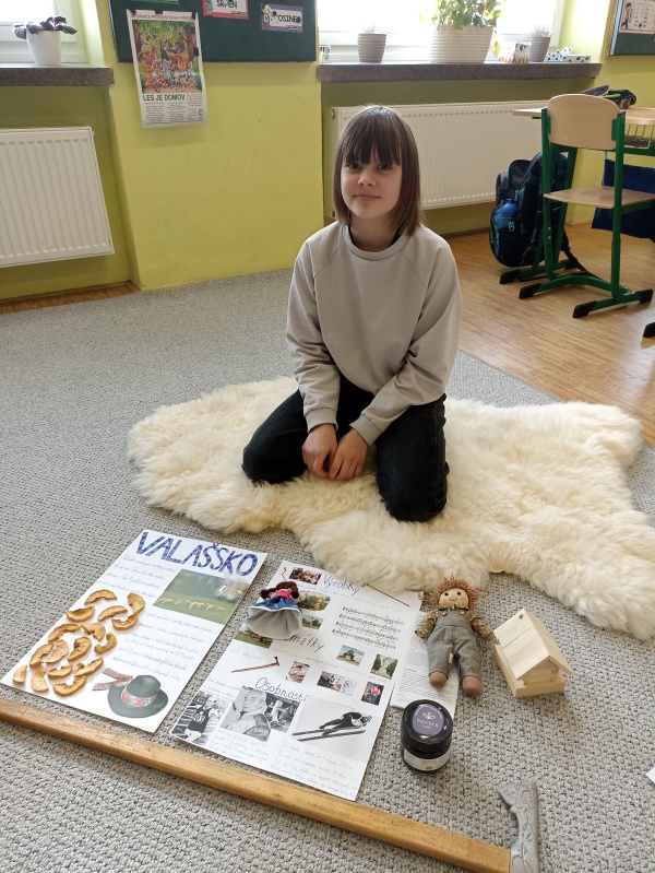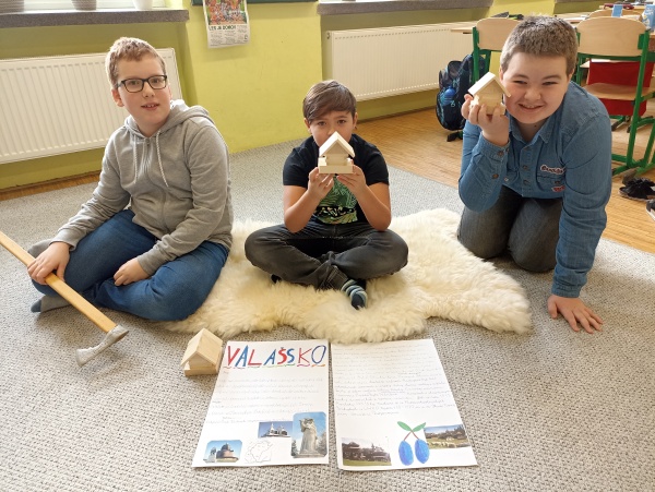 V rámci vlastivědy jsme se pustili do projektu o Valašsku. Nejprve jsme zhlédli prezentaci, ve které jsme se seznámili s vymezením oblasti a hlavními rysy. Následovala skupinová práce. Vyhledávali jsme informace z různých zdrojů – internet, časopisy, knihy, a vše jsme zapisovali do našeho projektu. Někteří z nás čerpali i ze vzpomínek našich prarodičů. Práce nás moc bavila, a proto jsme si přinesli názorné ukázky i z domu. Ve třídě se nám tak sešel pár valašek, ovčí kožešina, domácí kotloviny, část valašského kroje, valašská panenka, ukázka modrotisku, valašská chaloupka aj. Ochutnali jsme valašské frgály, sušená jablíčka a domácí chleba. Projektem jsme propojili i pracovní činnosti ve školních dílnách, ve kterých jsme si vyrobili dřevěnou roubenou chaloupku a v hudební výchově se věnovali valašské písni a tanci. Projekt jsme završili ve školní kuchyňce. Zde jsme si uvařili valašskou specialitu, a to pravou valašskou kyselici 😊.