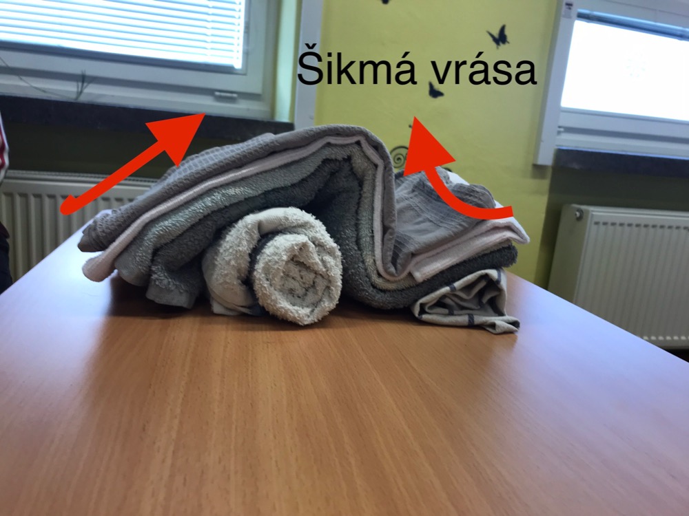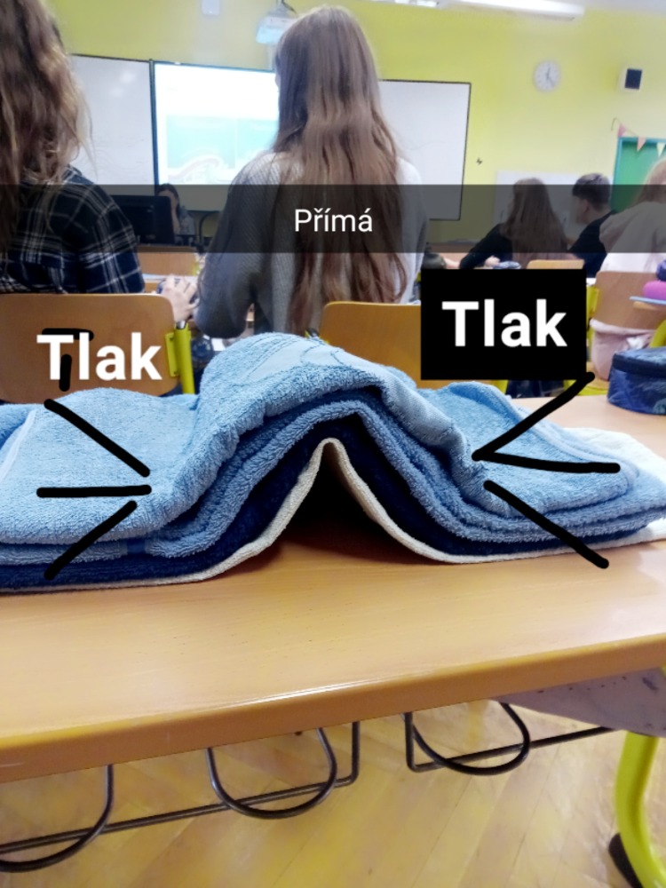 Žáci se rozdělili do skupin a jejich úkolem bylo poskládat ručníky na sebe. Každý z ručníků pak představoval jednu geologickou vrstvu. Pak už zbývalo vymodelovat geologické tvary a děje, např. přímou a šikmou vrásu, přesmyk nebo zlomy - zdvih, pokles, horizontální posun a příkopovou propadlinu. Jednotlivé tvary žáci vyfotili a do fotek přidali popisky a šipky sloužící k vysvětlení dějů, které se v litosféře odehrávají.