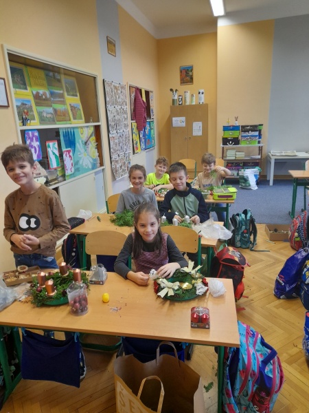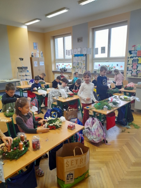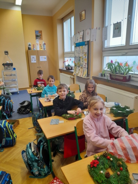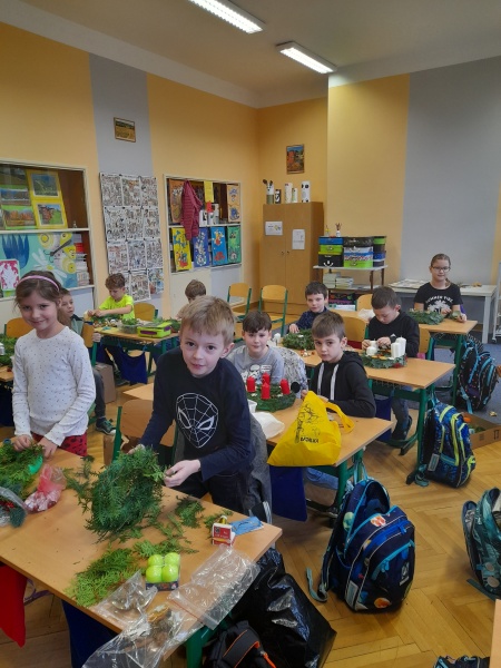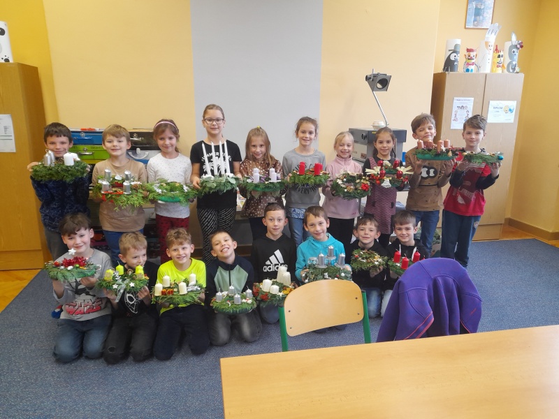V pátek 25. 11. 2022 si naši druháci vyrobili adventní věnce. Nějaké zkušenosti děti získaly už vloni, takže letos jim šla práce hezky od ruky. Všichni byli moc šikovní, vzájemně si pomáhali a výsledkem jejich snažení byly moc pěkné věnečky, které budou o Vánocích zdobit jejich štědrovečerní stůl.