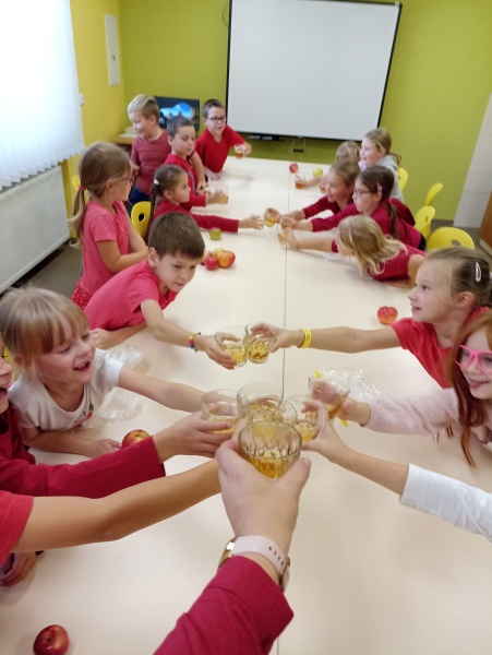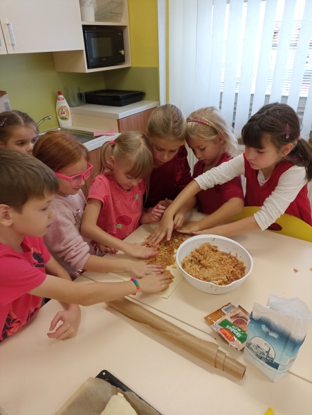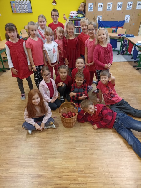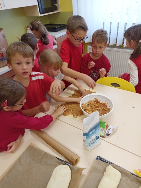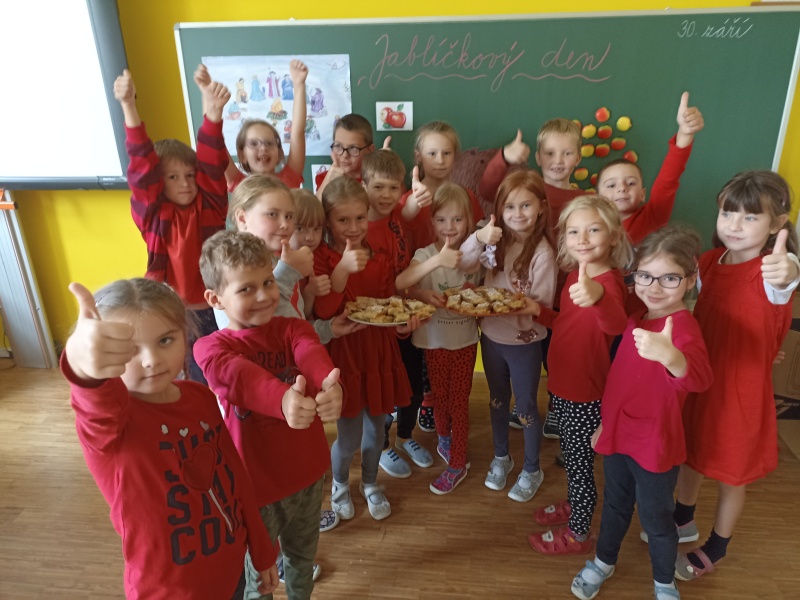 Páteční vyučování v 1. třídě bylo takové.... "jablíčkové". V první hodině jsme si povídali o jablíčkách, plnili různé úkoly a nemohli se dočkat, jak se přesuneme do školní kuchyňky, kde jsme si chtěli upéct jablečný štrúdl. Štrúdl se nám podařil a chutnal na jedničku - vždyť jsme také všichni přiložili ruku k dílu :-). A po dobře vykonané práci jsme si připili jablečnou šťávou a ještě nám zbyl čas, zatancovat si na závěr ve třídě mazurku. Písnička: "Měla babka čtyři jabka..." nám zněla v uších ještě hodně dlouho.