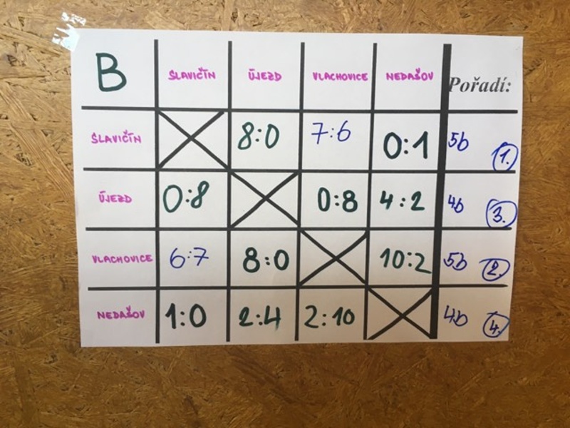 V úterý 28.3. se naše škola zúčastnila dalšího turnaje vrámci Valašské sportovní ligy, a to tentokrát v košíkové chlapců. Turnaj nás nezastihl v dobré formě, protože jsme obě úvodní utkání prohráli shodně 0:8 nejprve se ZŠ Vlachovice a poté se ZŠ Slavičín. Kluci se zvedli v posledním zápase ve skupině, kdy porazili ZŠ Nedašov 4:2. V utkání o 5. místo jsme předvedli zodpovědný výkon a zápas skončil 0:0, bohužel jsme nakonec prohráli na trestné hody 0:1. V konečném pořadí jsme obsadili 6. místo.