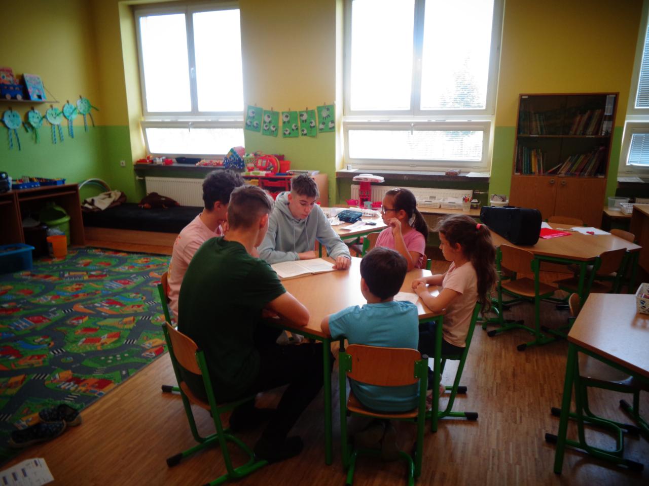 V pátek 24. 5. 2024 se naše 9.A v podstatě vrátila v čase. Pátou vyučovací hodinu jsme se totiž odebrali do družinky, abychom mladším žákům předčítali zábavné pohádky, například o vších a jak s nimi zatočit nebo o hrochovi Oranžochovi, který spolkl slunce. Byli jsme rozděleni do šesti skupin, ze kterých čtyři předčítali, jedna kontrolovala pozornost dětí při čtení a poslední je naučila, jak vyrobit vlaštovku a hodit ji co nejdál. Prvňáčci se nás zpočátku báli, ale jsou soutěživí, takže se zapojili do práce s chutí a nadšením. A my starší jsme byli šťastní, protože jsme se nemuseli učit.