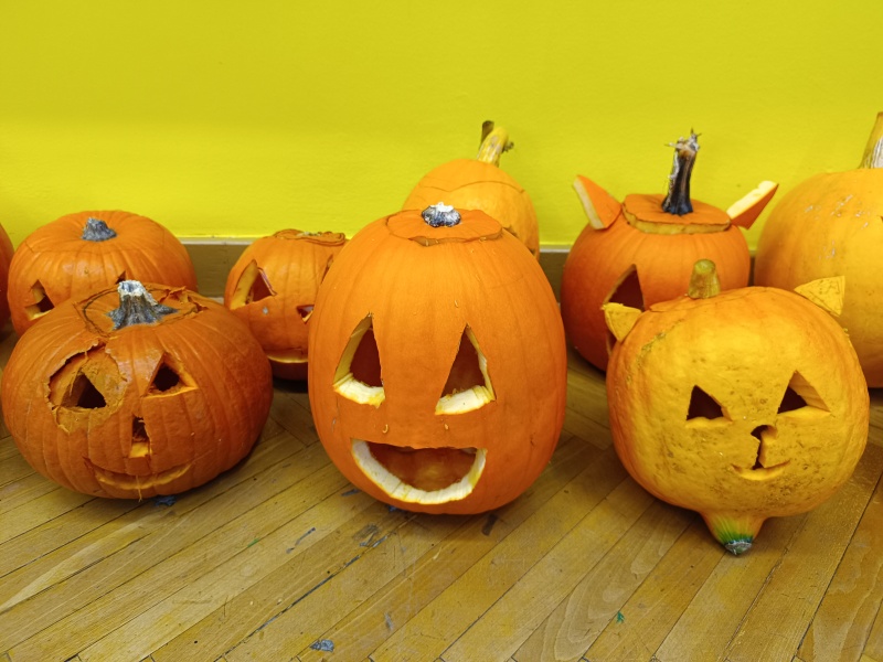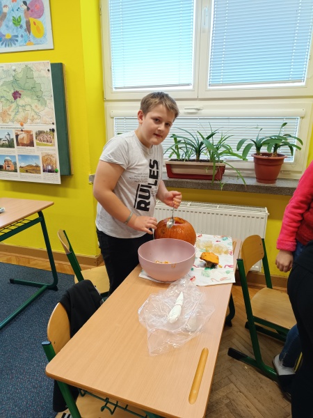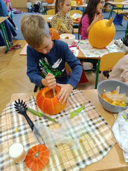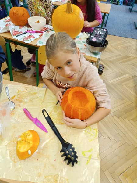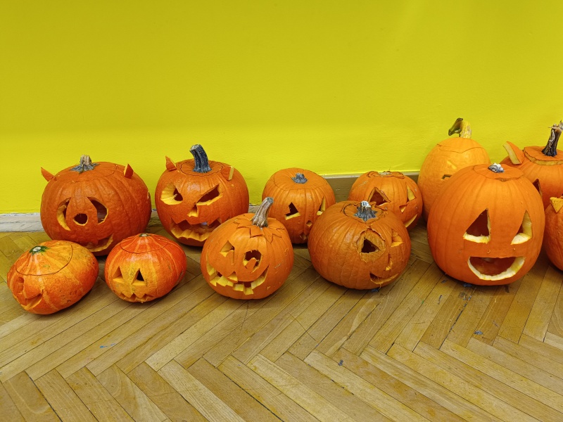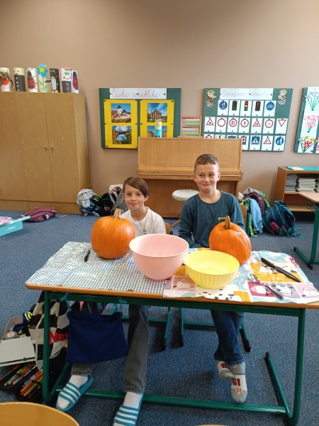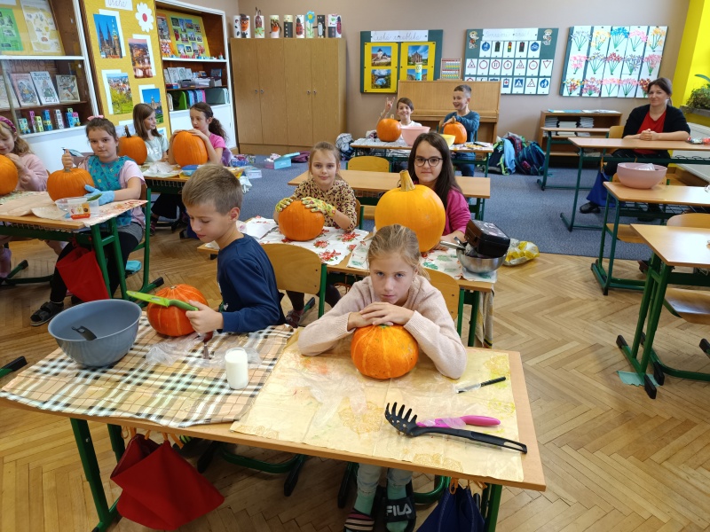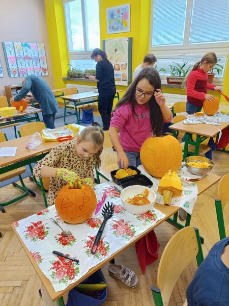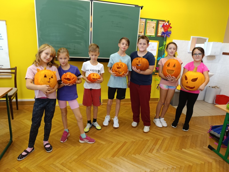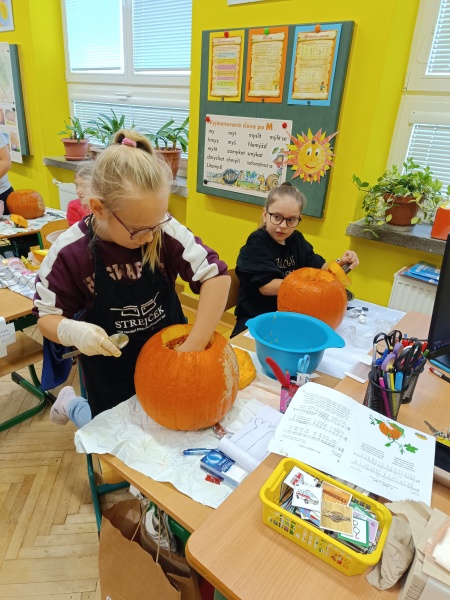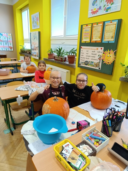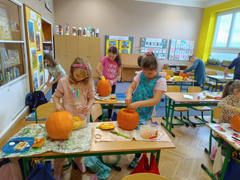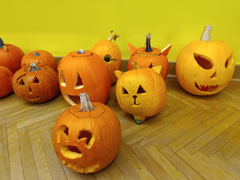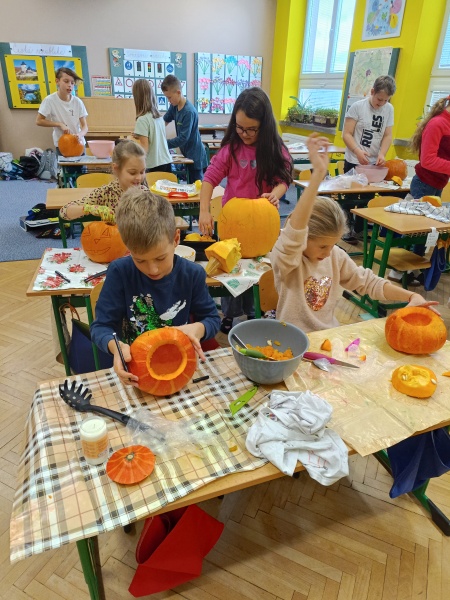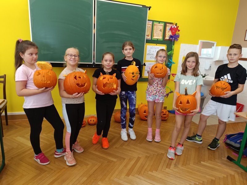 Dnes jsme se pustili s dětmi do vyřezávání dýní. Začali jsme kresbou toho, jak by měla dýně vypadat - u některých legračně, u jiných strašidelně či rozpustile. Nakonec vypadají všechny moc mile. Děti byly velmi šikovné a hlavně opatrné, takže dvouhodinové úsilí stojí za to. Dýně se jim moc povedly. Koneckonců posuďte sami.