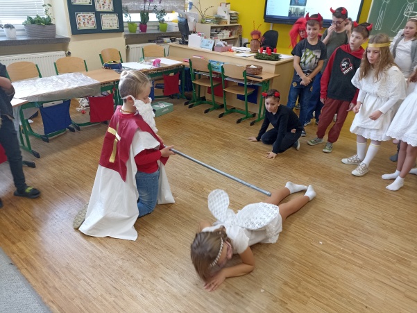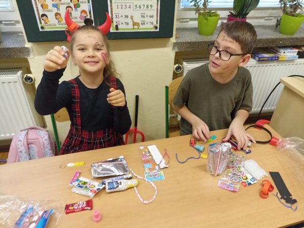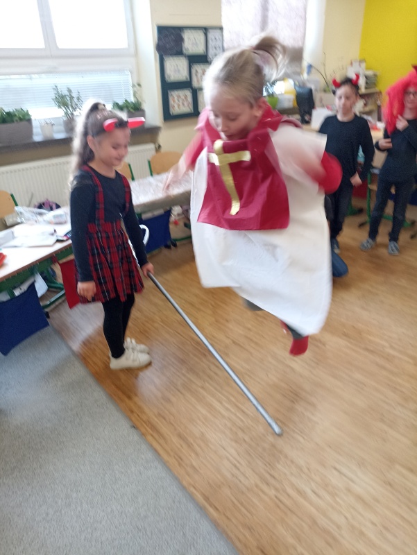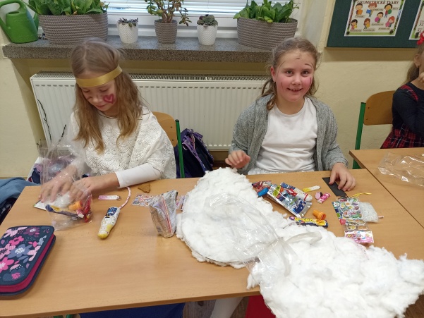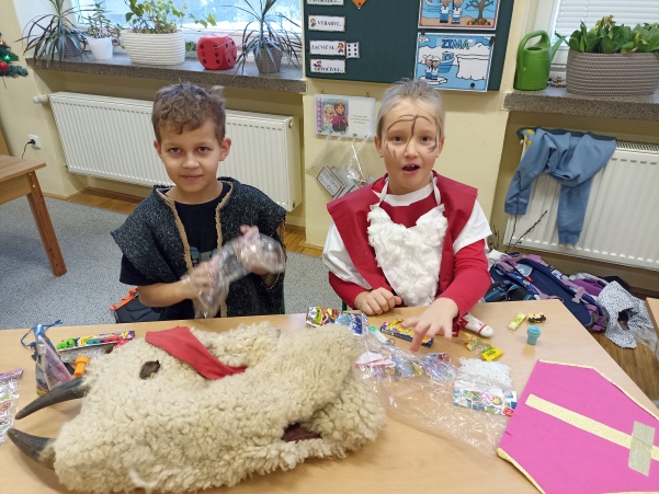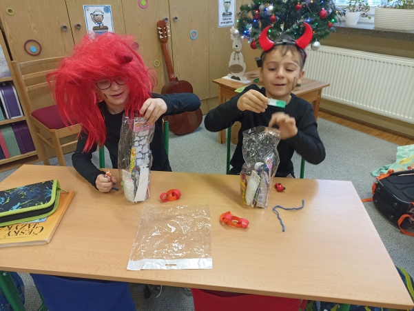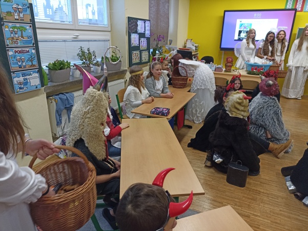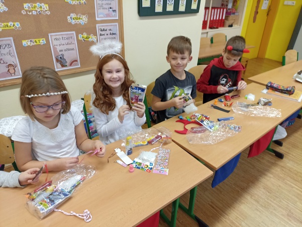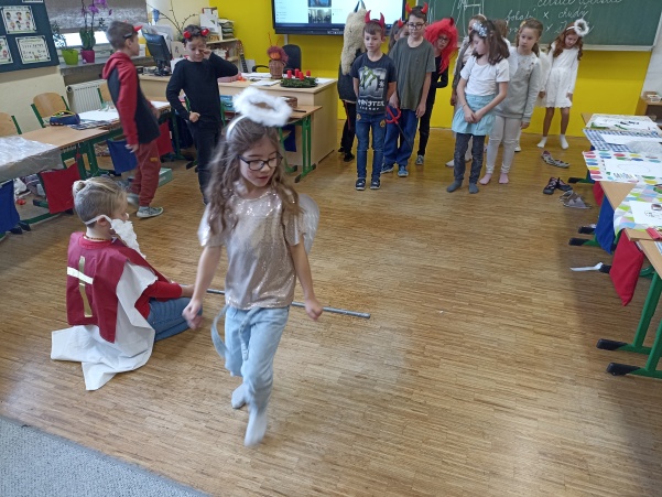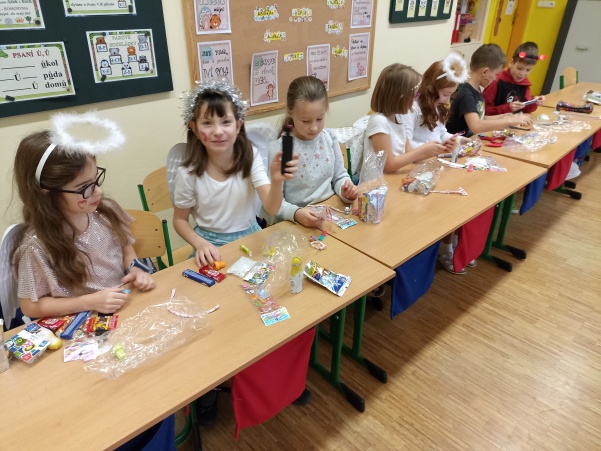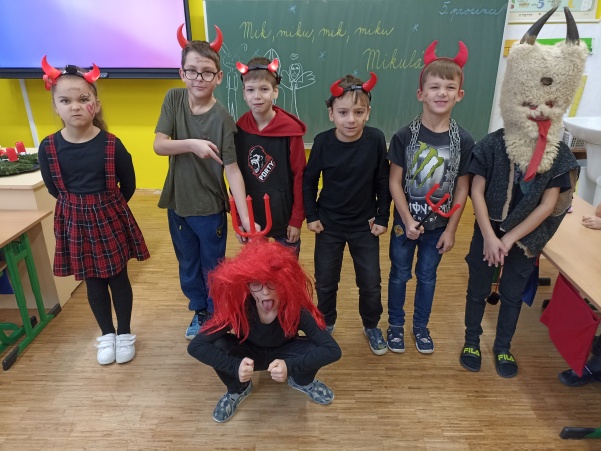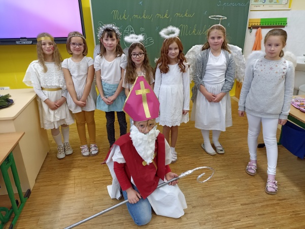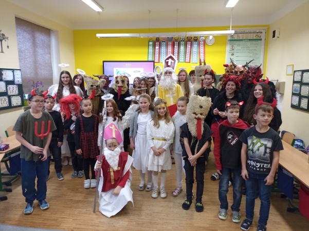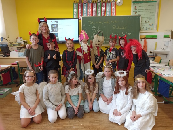 Po návštěvě mikulášské družiny našich šikovných deváťáků jsme pokračovali i ve vyučování putováním za svatým Mikulášem. V jazyku českém jsme si o něm více přečetli a splnili úkoly, v matematice nás čekali čertovské příklady a ve výtvarné výchově jsme kreslili mikulášskou družinu a při práci si i zazpívali. Mezitím nám zbyl ještě čas na sportovní chvilku, kdy jsme přeskakovali nebo podlézali mikulášskou berlu. Ale největší radost jsme stejně měli z balíčků, které jsme dostali od Mikuláše.