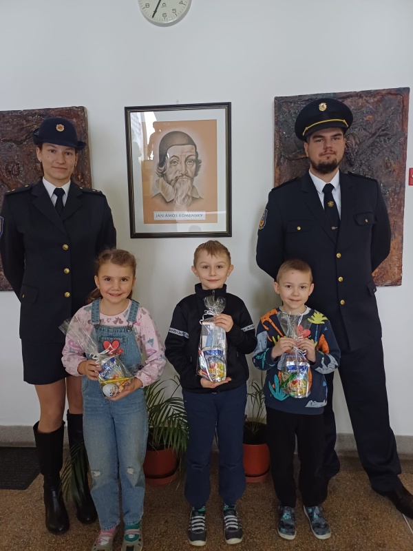 Ráda bych poděkovali členům místního sboru hasičů slečně Nele Drgové a panu Jiřímu Čechovi, kteří se ujali vyhodnocení soutěže. Vítězné práce dětí odměnili, odvezli do dalšího kola a ještě jim zbyl čas, aby navštívili 1. třídu a odpověděli na všechny všetečné otázky prvňáčků.