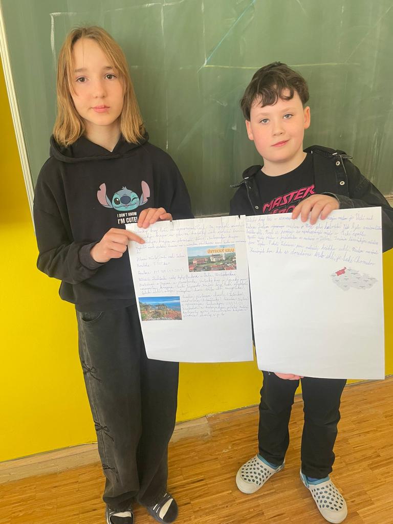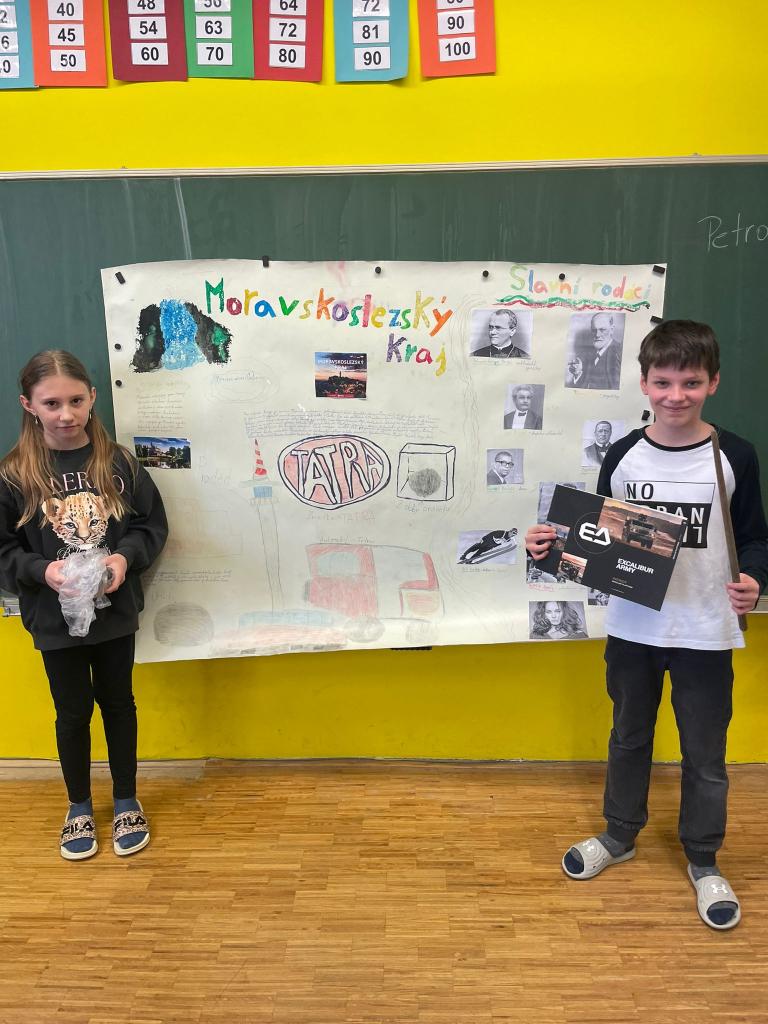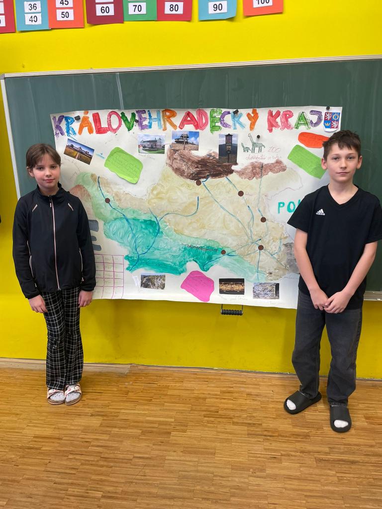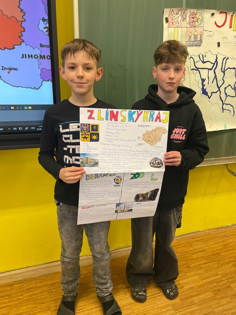 V rámci výuky vlastivědy žáci 5. třídy pracovali na projektovém vyučování zaměřeném na jednotlivé kraje České republiky. Každá dvojice zpracovala projekt o vybraném kraji a následně jej prezentovala před spolužáky. Žáci si tak rozšířili své znalosti, procvičili spolupráci ve dvojicích i prezentační dovednosti.