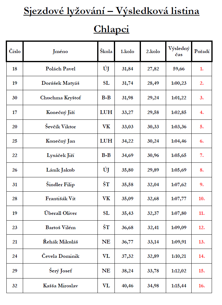Díky součtu všech umístění jsme se v celkovém hodnocení škol umístili na krásném 2. místě, což je skvělý úspěch. Chtěl bych poděkovat vlekařům a obci Újezd za vytvoření ideálních podmínek pro závodníky.