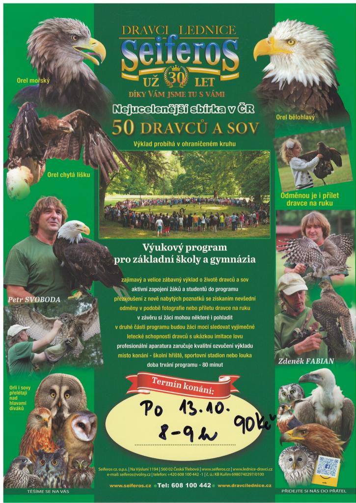 V pondělí 13.10. 2025 je pro všechny žáky ZŠ a MŠ Újezd připraven výukový program "50 dravců a sov".